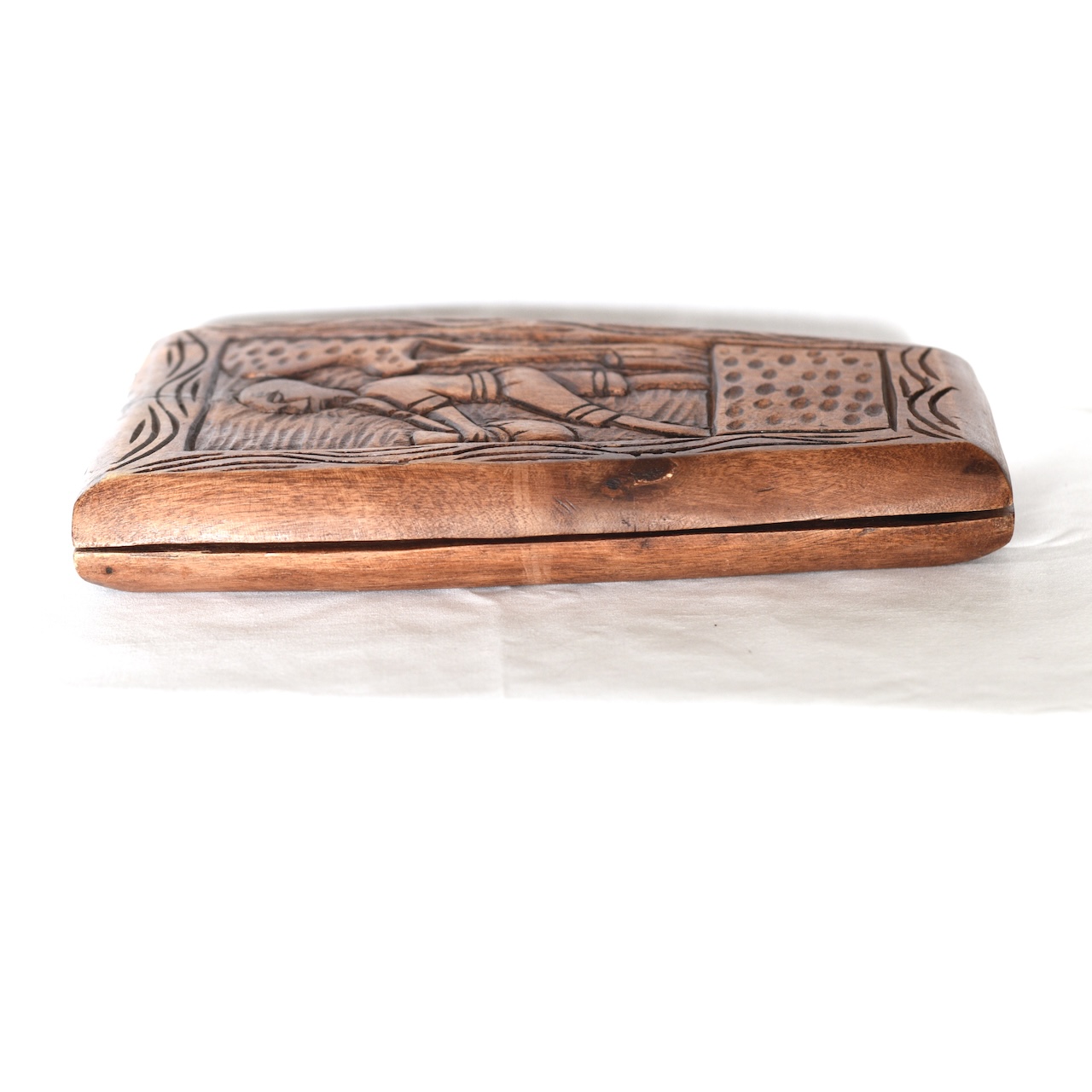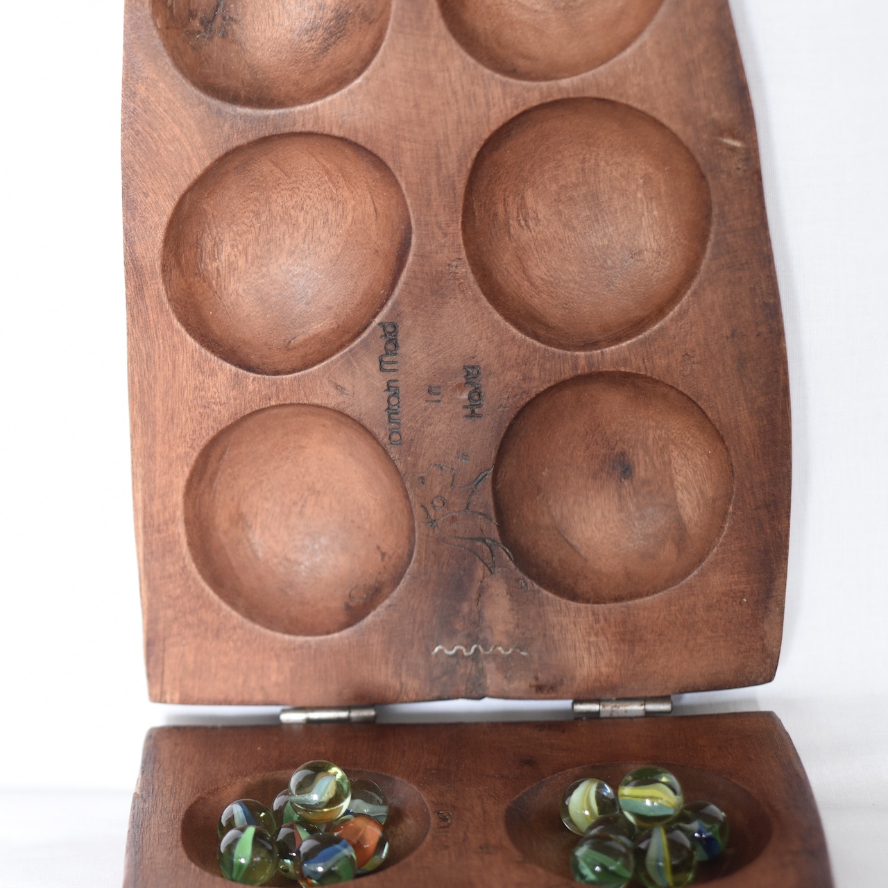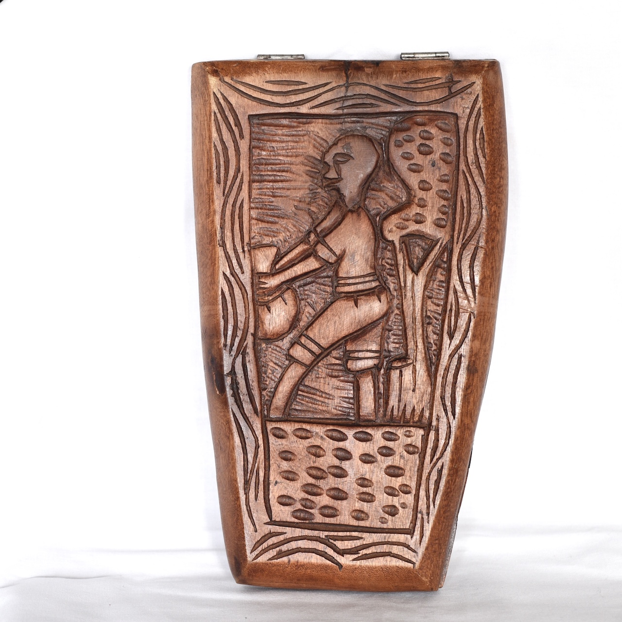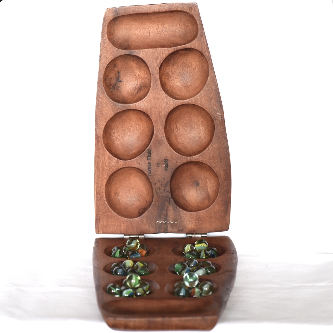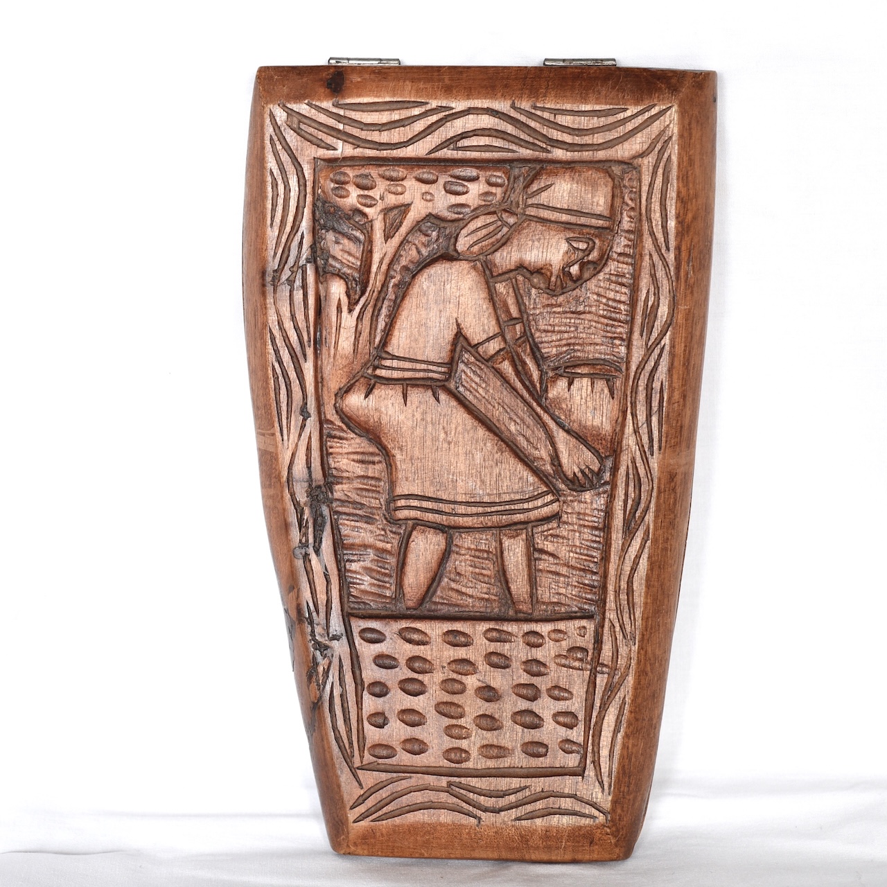Hinged and hand carved on both sides Mountain Made Mancala or Warri game with glass marbles. Measures 11.5″ when closed x 6.5″ wide. Measures 23″ long when open. Detailed hand carving on each side depicting a man carrying a jug with a tree behind him on one side. On the other side there is a woman partially bent over, carrying something. She also has a tree behind her in the carving. It is in excellent condition.