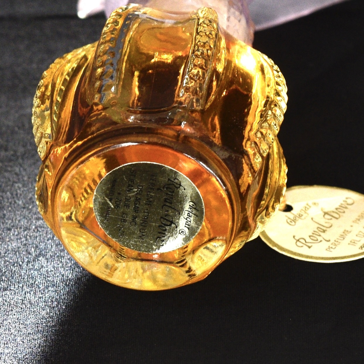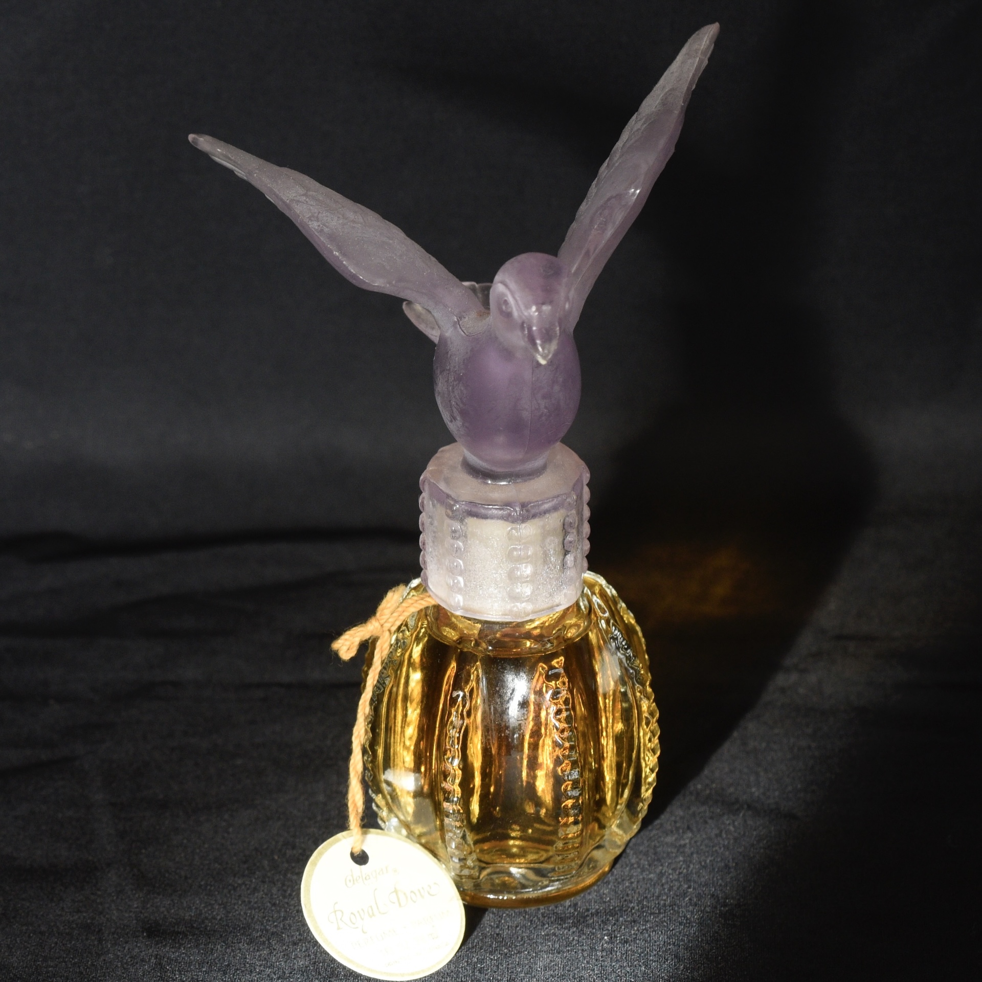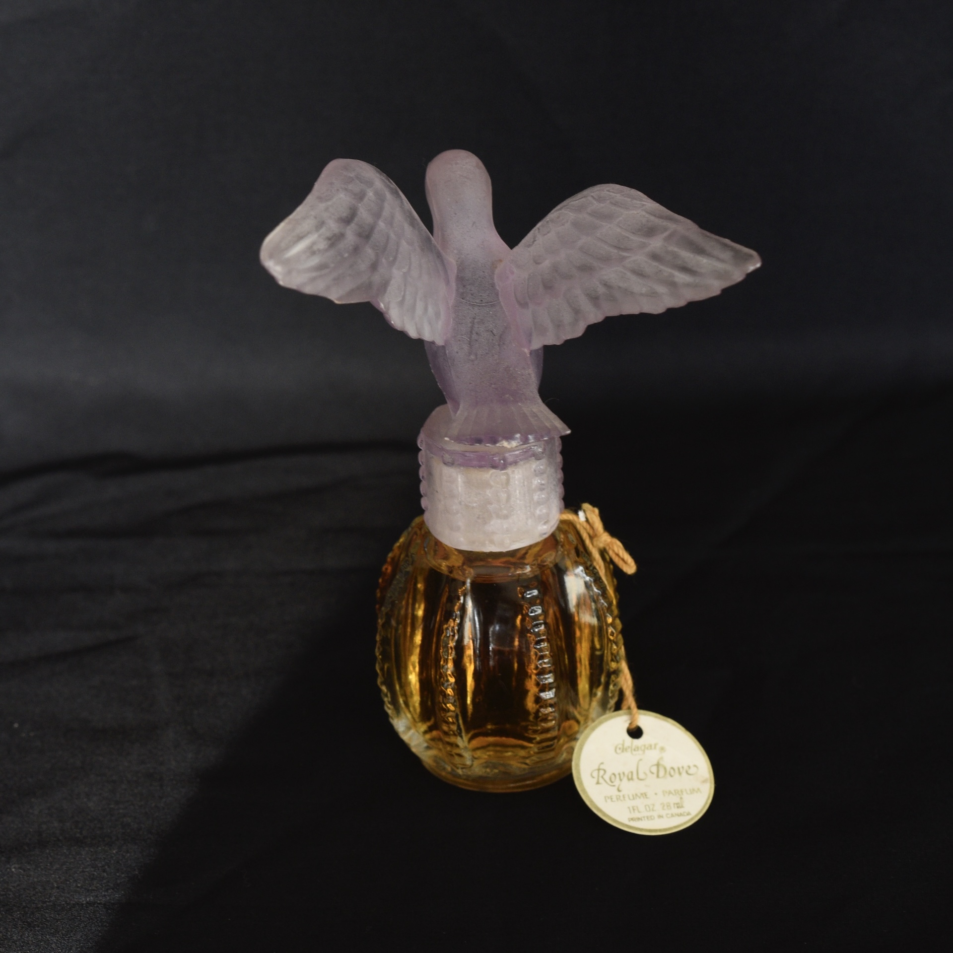 Measures 4.75″ high. Has not been opened. Tags still on the side, and foil stamp on bottom. The dove on theĀ top is clear plastic with a hint of mauve or lavender colouring. Must be shipped by ground because of the perfume.