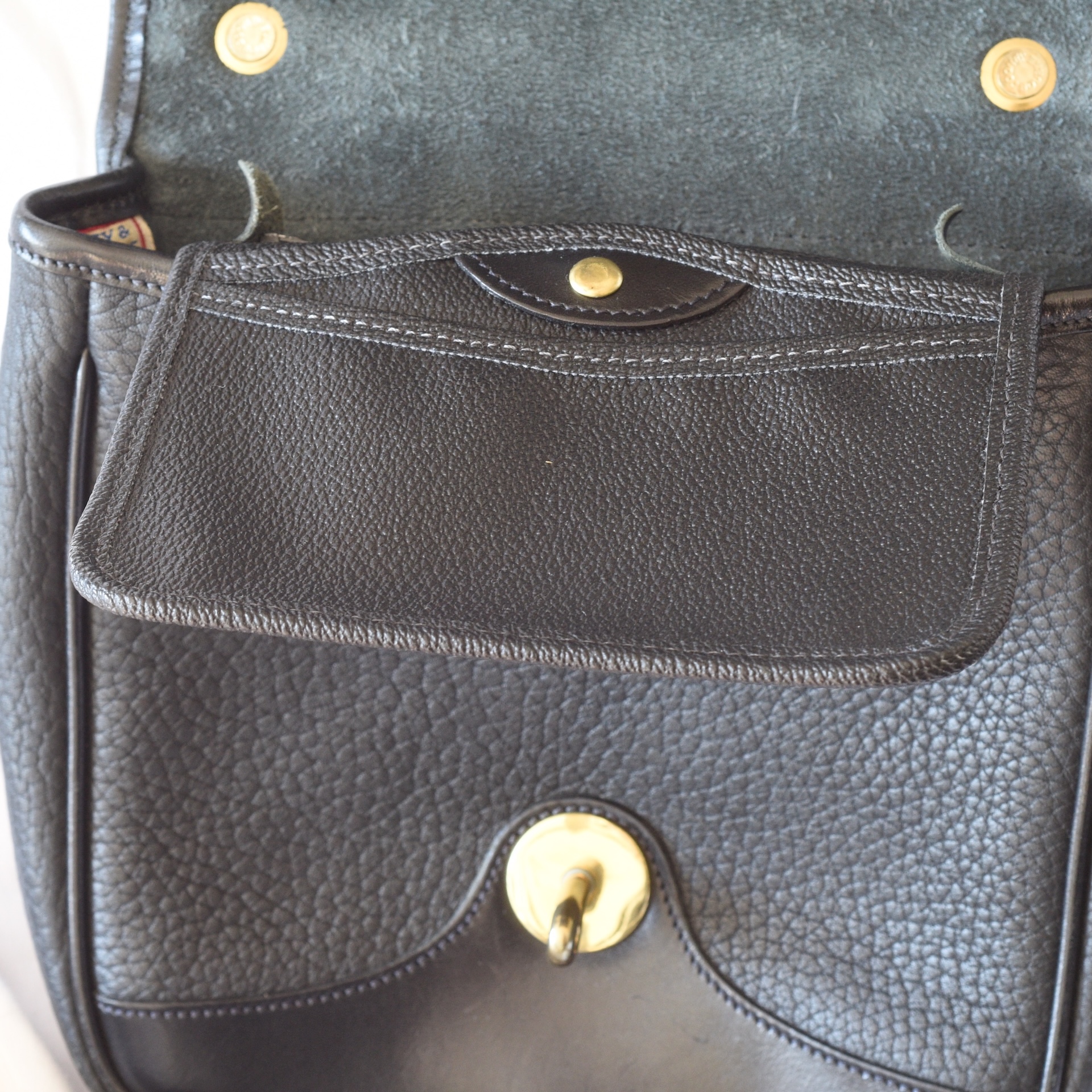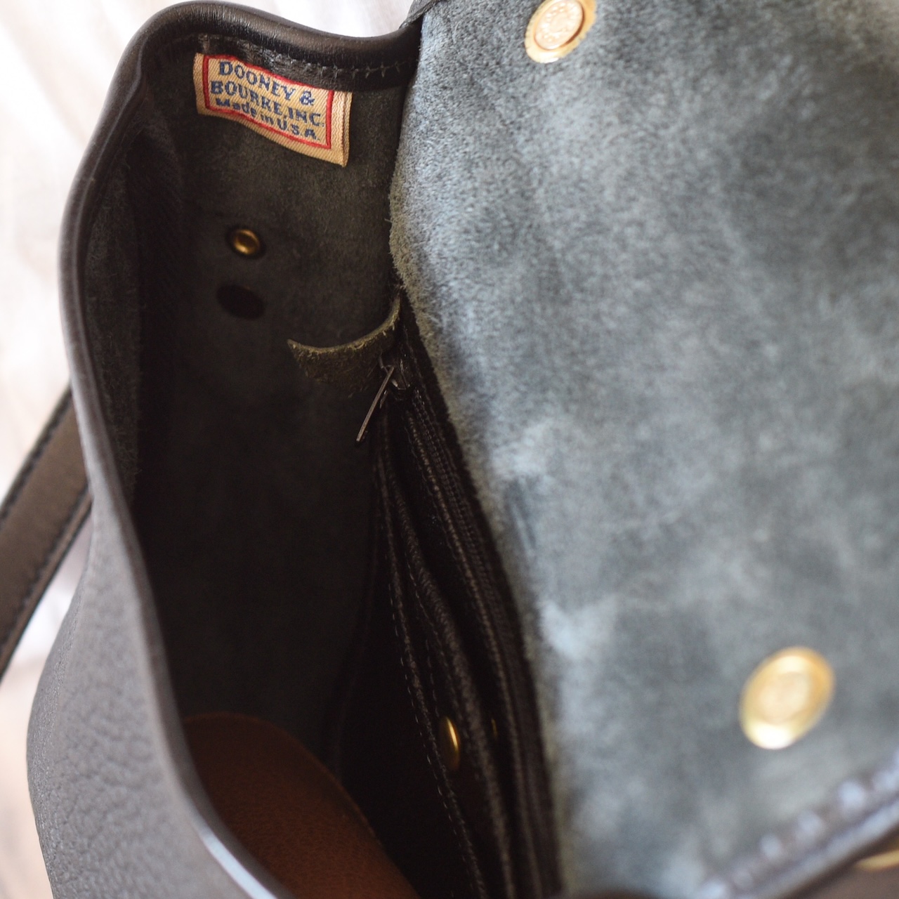 Black leather cowhide bag with one open pocket inside, one with a snap and a third with a zipper. The long leather handle allows for cross body wear. It also has a top handle. It is suede leather inside. There is a serial number (see photo). It measures 8 1/2″ x 8 1/2″. The drop on the handle can be extended to 24″. There is an open flap pocket on the exterior back of the purse. It is in excellent condition. Solid brass hardware. The authentic red, white and blue label inside reads Dooney & Bourke Inc. Made in U.S.A. Above the serial number it reads “Square Vintade Carrier”. This was an all weather carrier bag made in the USA in the late 1980’s or early 1990’s.