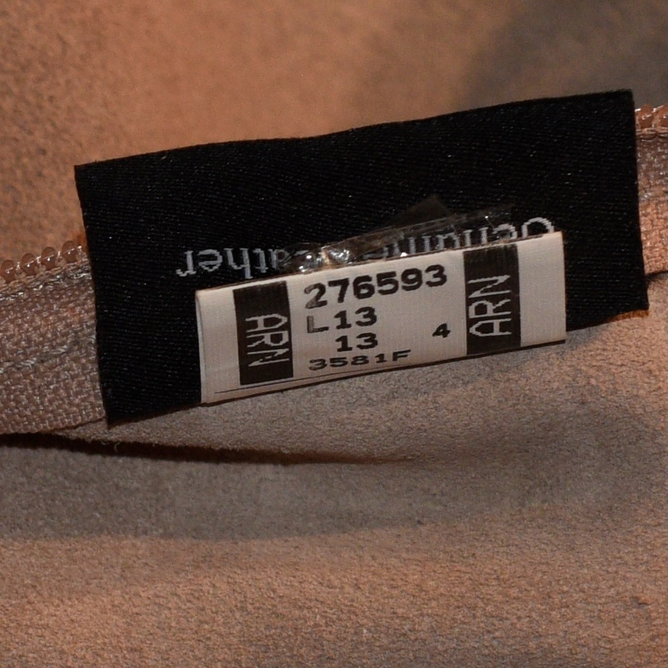 This simple suede bag, features brass coloured studs on the front, leather handles, and a zip top closure. The bag has no frame, and no pockets. The label inside reads Furla Made in Italy along with the serial number. It measures 12″ wide x 11″ high, with a handle drop of 6 1/2″. It is in very good condition.