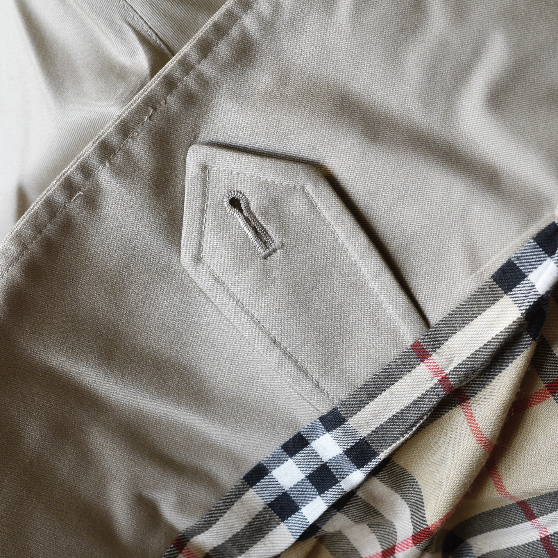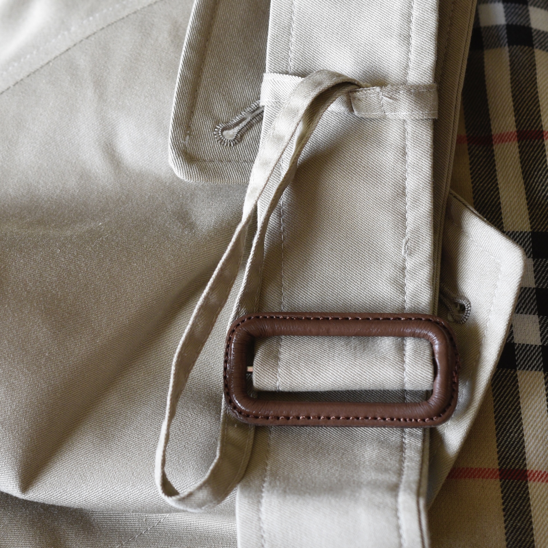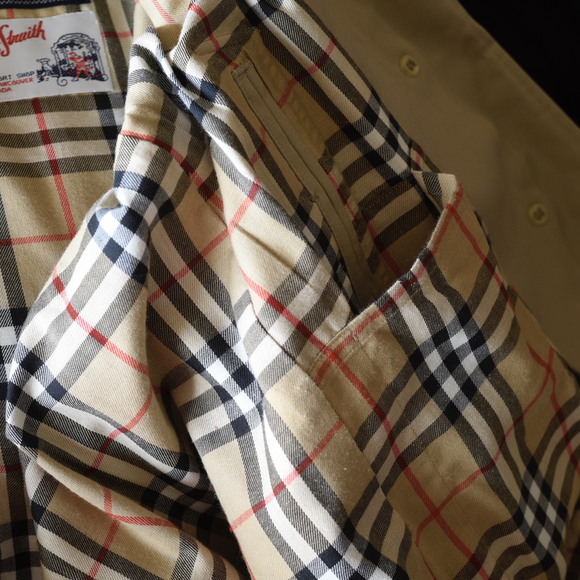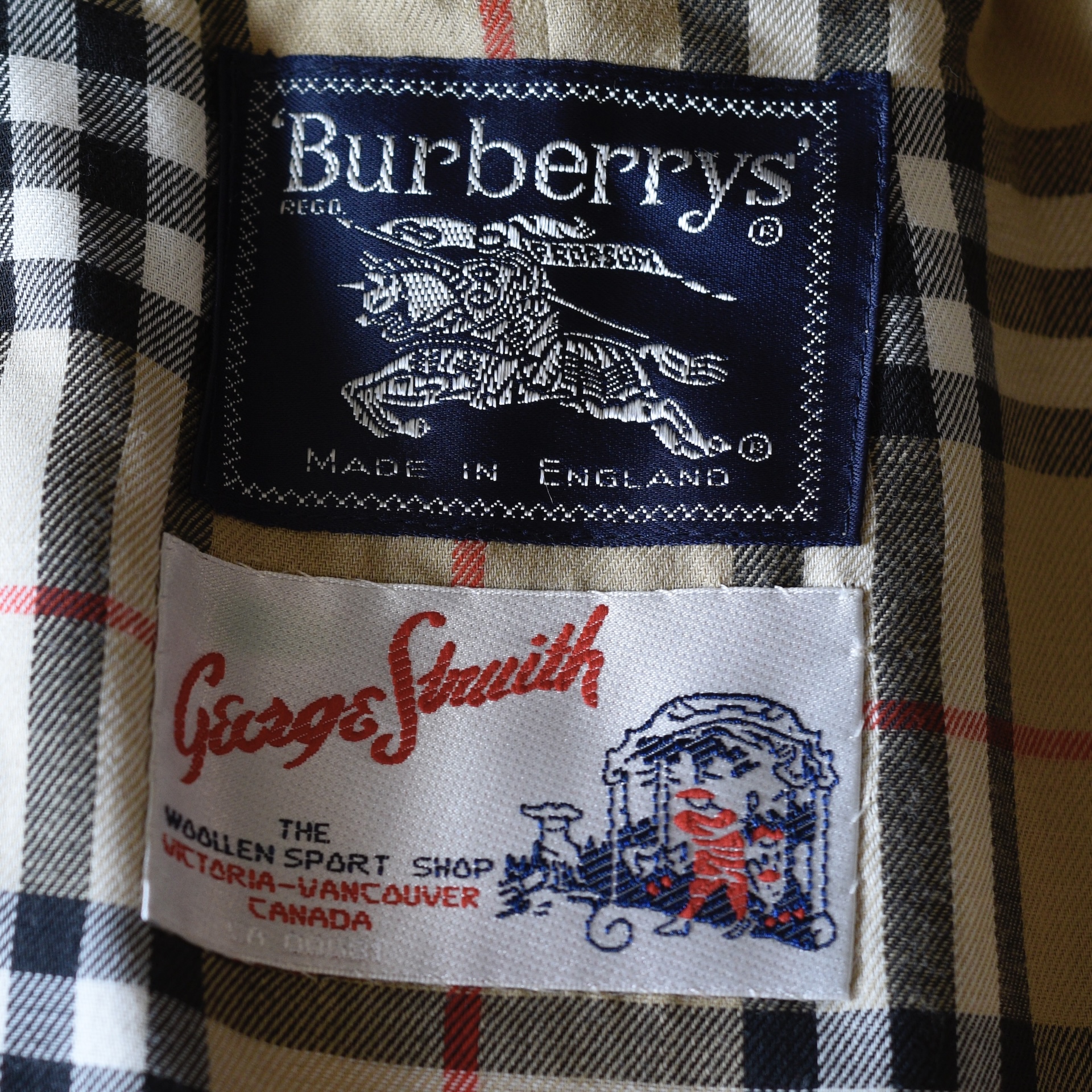 This bespoke trench coat is made in England and was from the George Smith Shop in Vancouver. It has covered front buttons and a belt with a leather covered buckle with impeccable stitching. The fabric label is 51% cotton, 48% polyamide. It is lined in the traditional Burberry plaid. The inside has two large pockets, and the exterior has buttoned pockets. It is monogramed. It measures Bust 38″ (pit to pit 19″) Waist is 40″ Hips 40″ Sleeves from collar 23.5″ Shoulder 17.5″ across. Length is 40″. It is in excellent/mint condition. Estimated to be 2010-16. Has all labels.