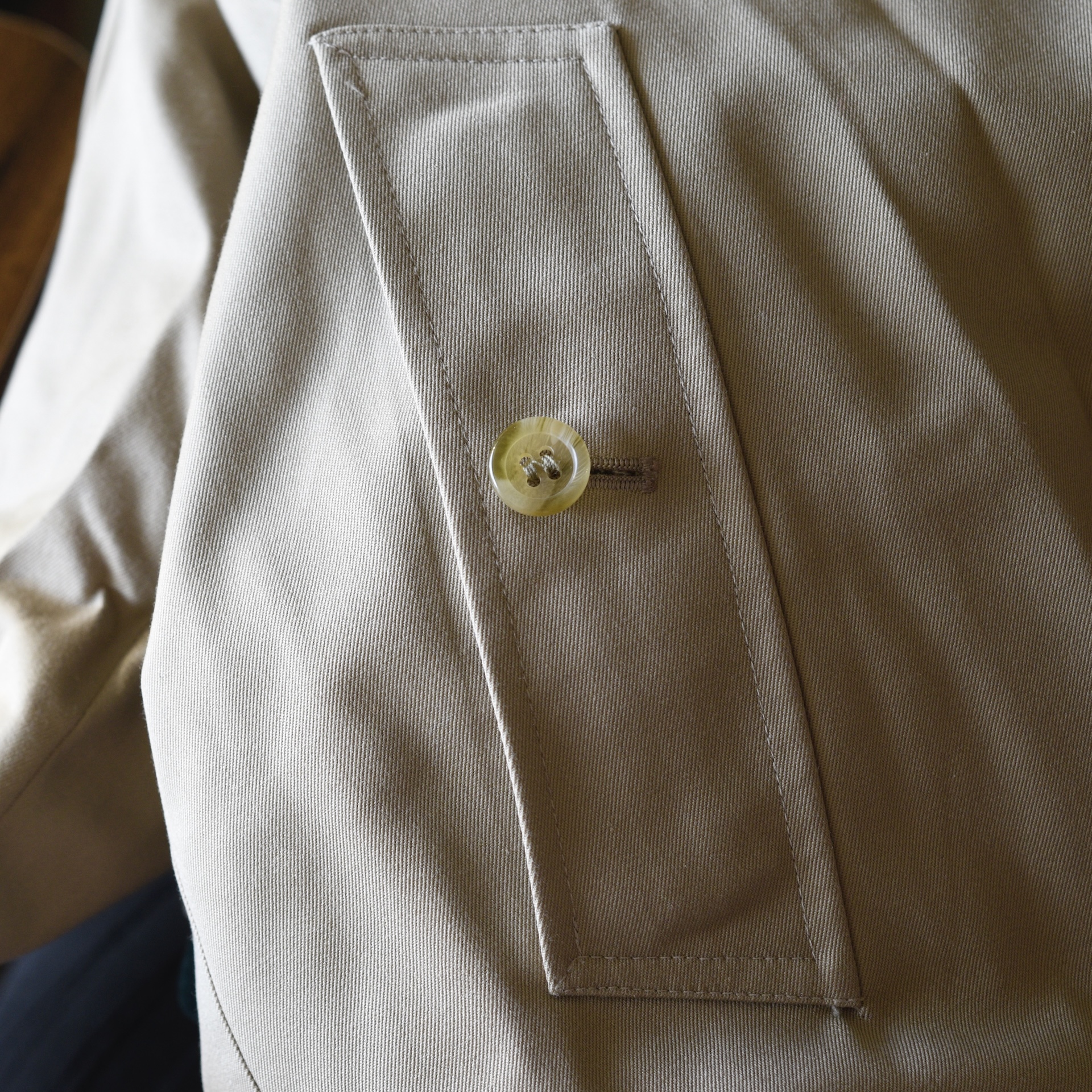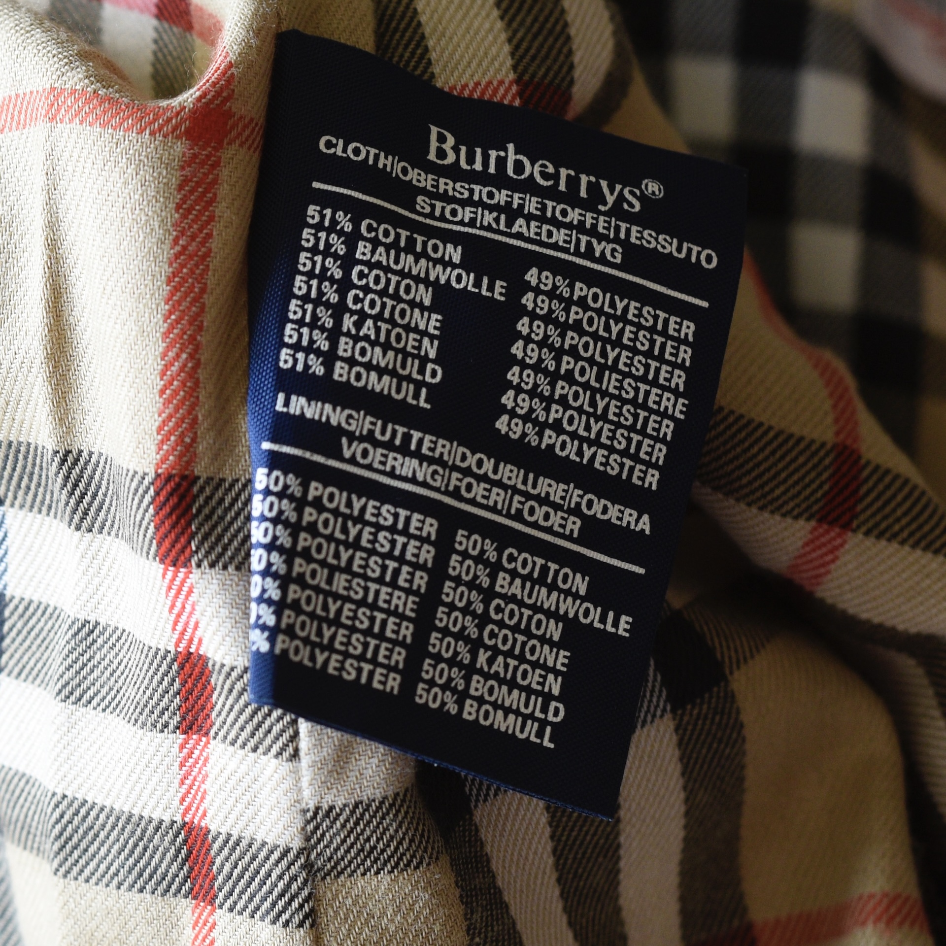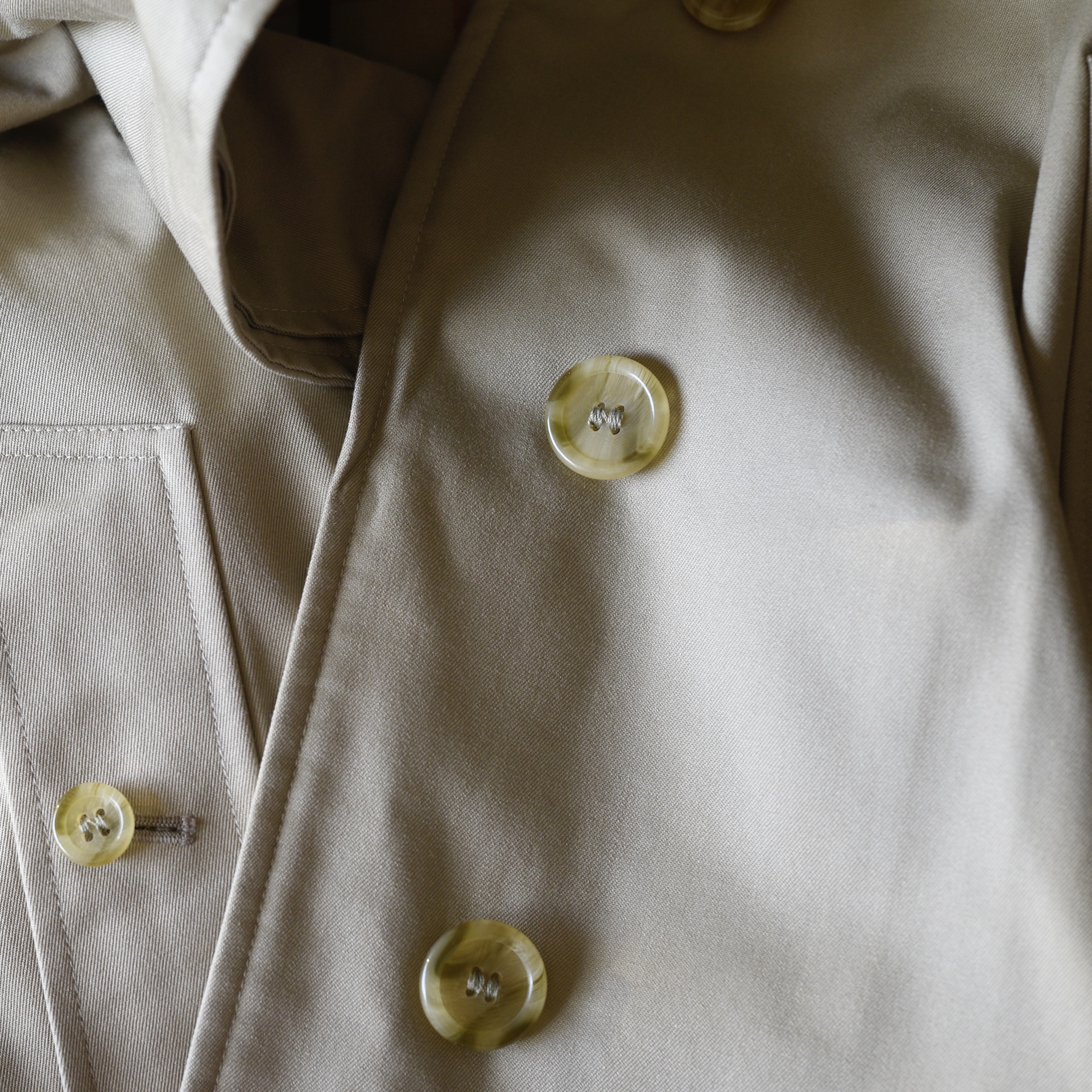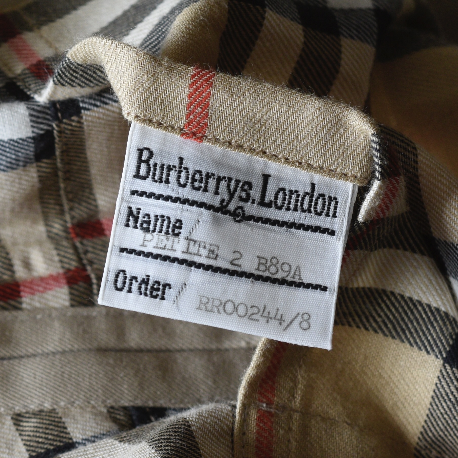 This bespoke trench coat is made in England and was from the George Smith Shop in Vancouver. It has covered front buttons and a belt with a leather covered buckle with impeccable stitching. The fabric label is 51% cotton, 48% polyamide. It is lined in the traditional Burberry plaid. The inside has two large pockets, and the exterior has buttoned pockets. It is monogramed. It measures Bust 38″ (pit to pit 19″) Waist is 40″ Hips 40″ Sleeves from collar 23.5″ Shoulder 17.5″ across. Length is 40″. It is in excellent/mint condition. Estimated to be 2010-16. Has all labels.