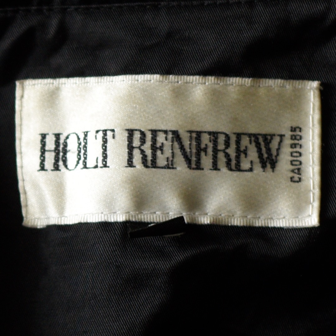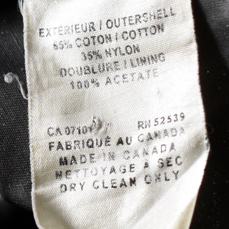 This rain coat is made of 65% cotton and 35% poly acrylic. It does not have shoulder pads. It has slide pockets on each side with velcro closures. Hidden buttons down the front with a small button at the collar. Size 8 on the label. It measures Shoulder to shoulder 18″ Bust 40″ Waist 40″ hips 40″ Sleeves 24″ Length 43″. It is in good condition. Made in Canada.
