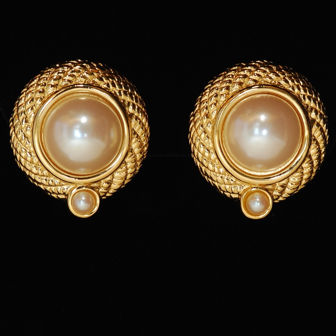 These Givenchy ear clips feature a large resin pearl, with a smaller pearl below. The pearls are surrounded by a textured gold tone metal. They measure 1 1/2″ in diameter. The backs are signed Givenchy Paris-New York (c).