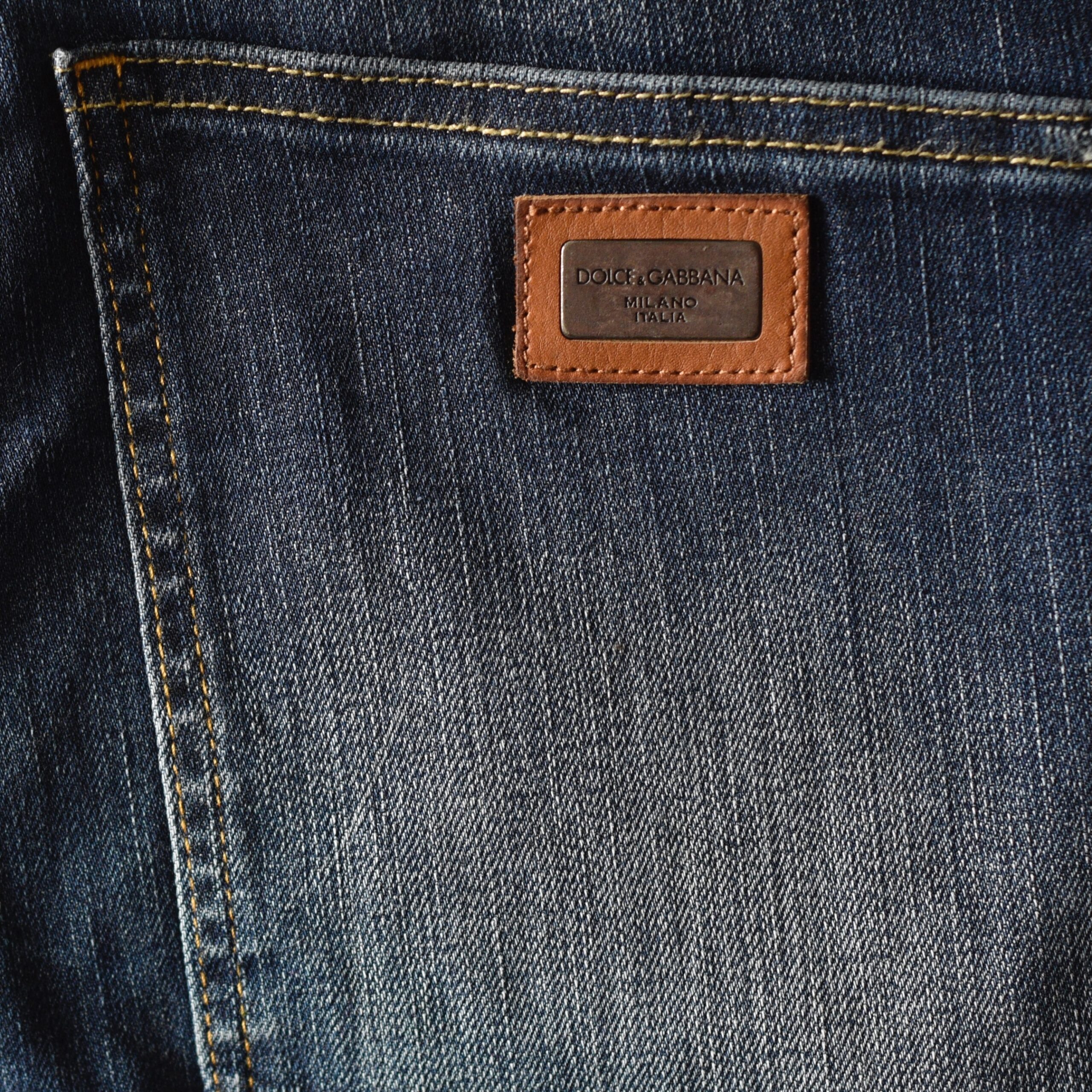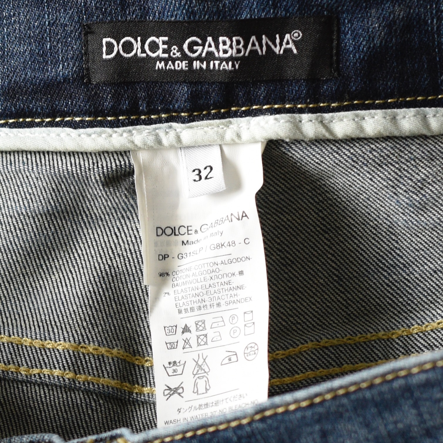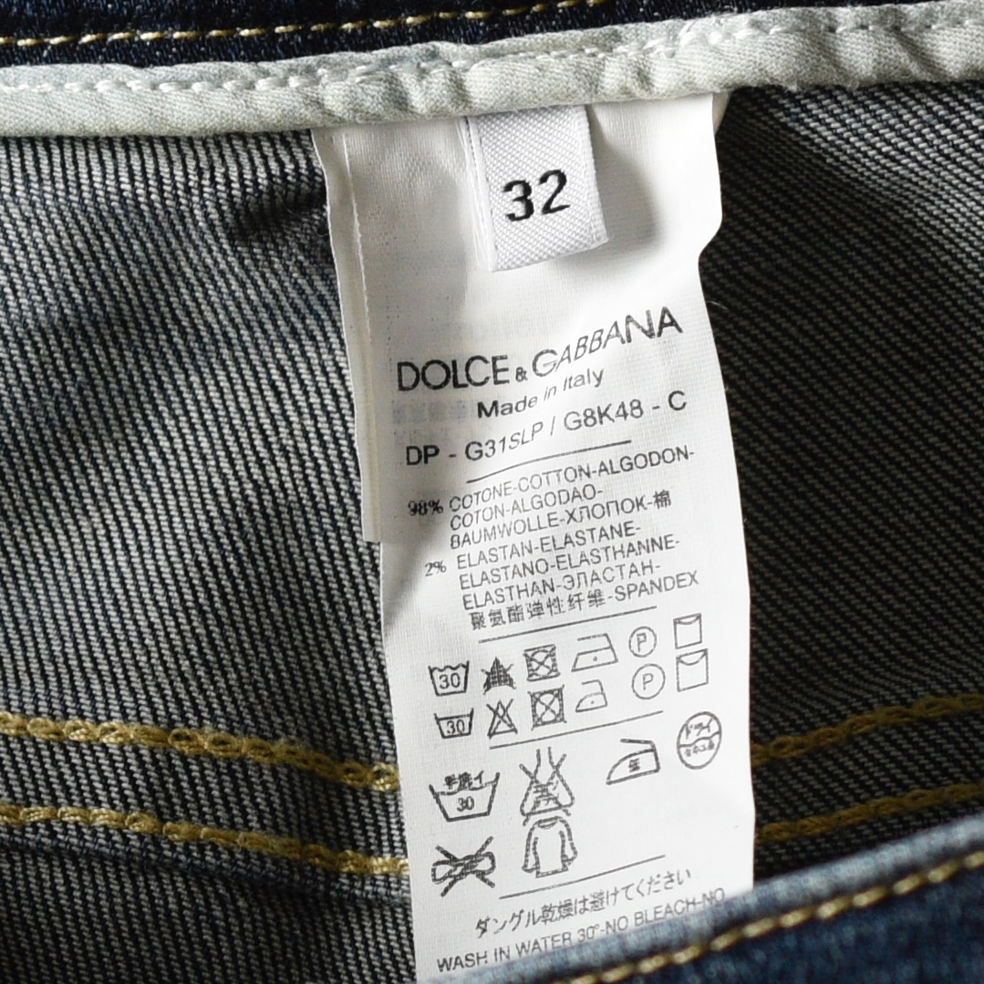 Dolce & Gabbana classic jeans moderately distressed. Size 32 on label. They measure Waist 32″ Hips 38″ Inseam 31.5″. The button is imprinted, and the back pocket patch is fairly discreet. They are in very good condition. Made in Italy