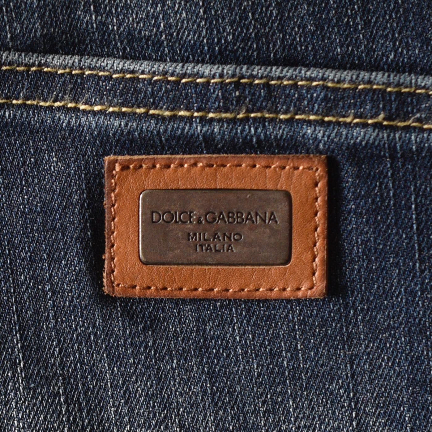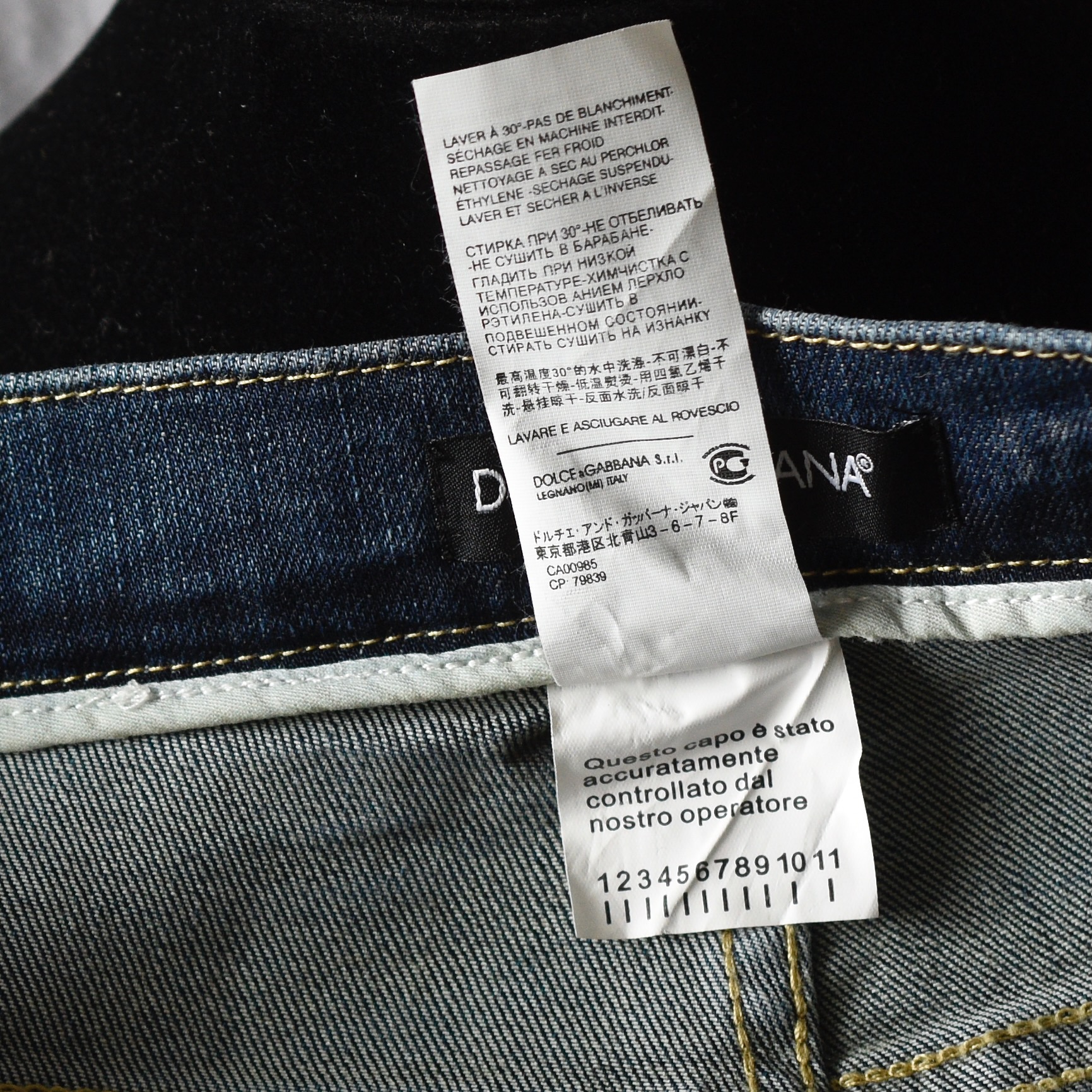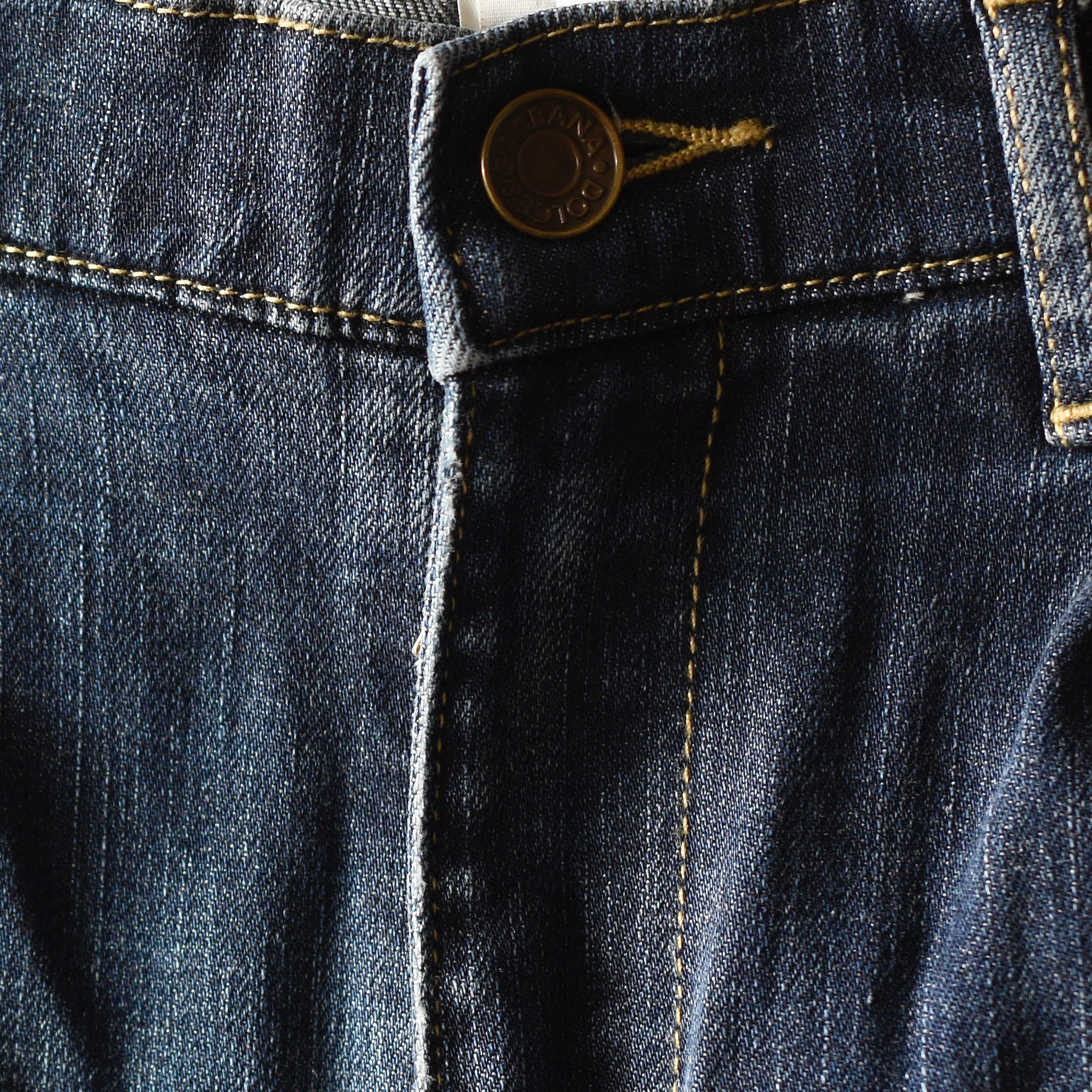 Dolce & Gabbana classic jeans moderately distressed. Size 32 on label. They measure Waist 32″ Hips 38″ Inseam 31.5″. The button is imprinted, and the back pocket patch is fairly discreet. They are in very good condition. Made in Italy