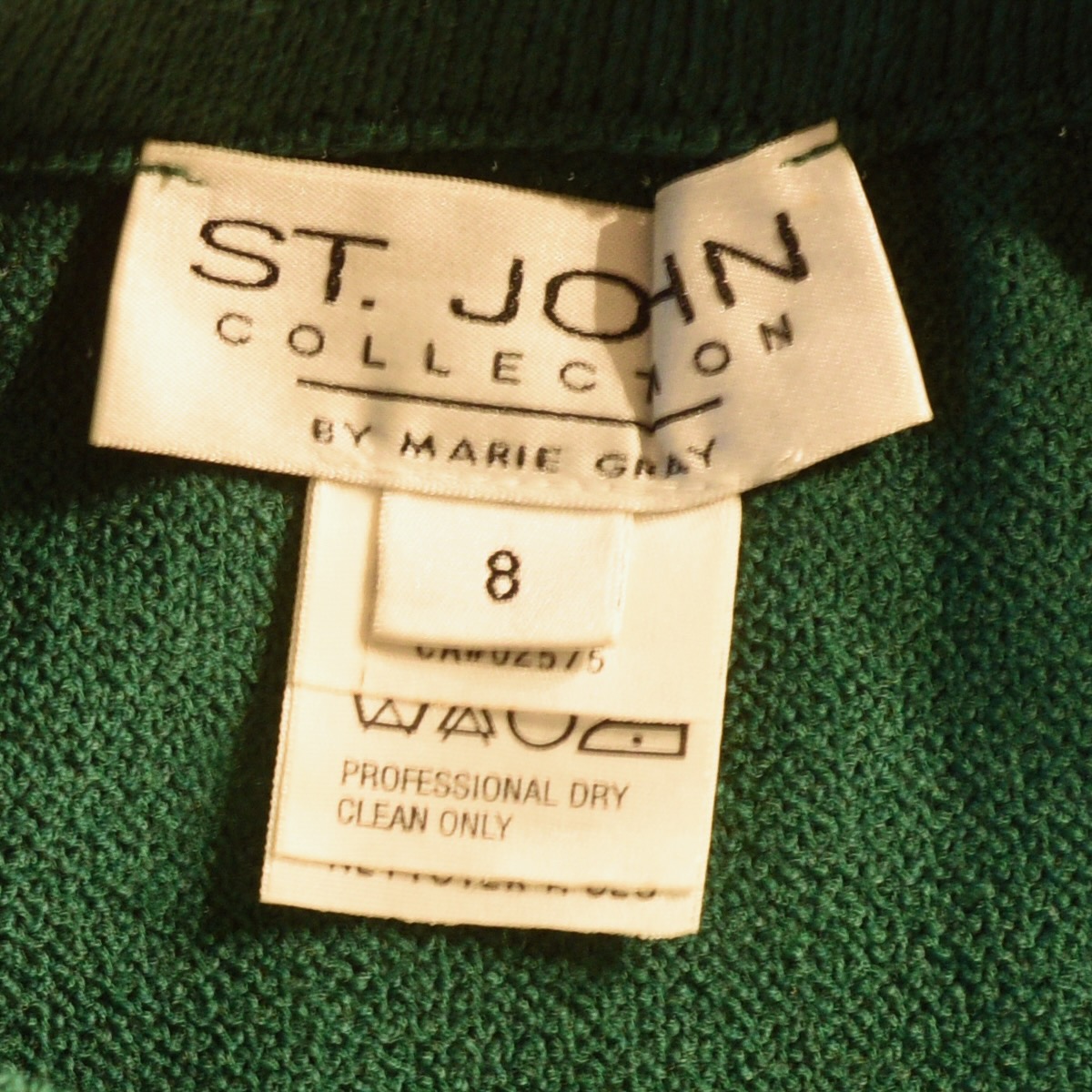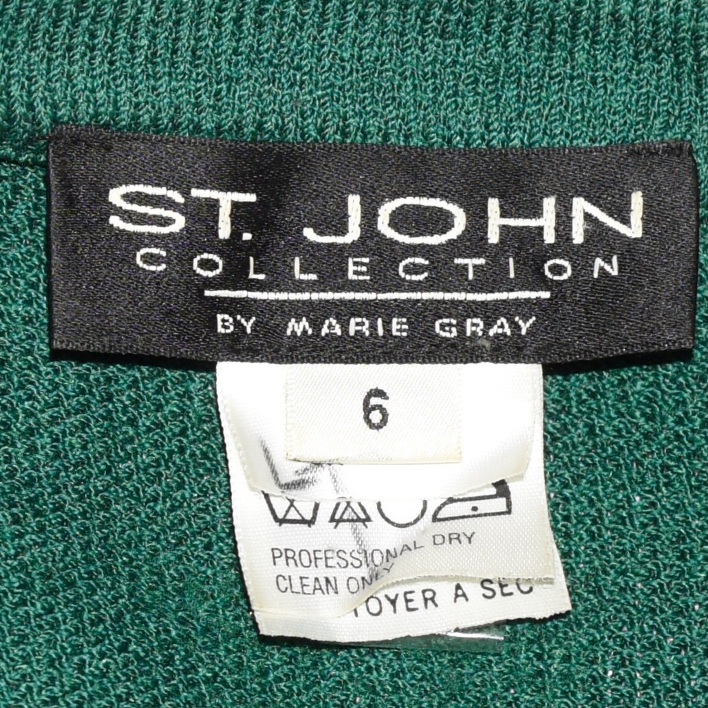 St. John Collection By Marie Gray green suit with fancy gold buttons. The fabric composition is 80% wool 20% viscose. The jacket has small shoulder pads, gold buttons down the front, on the faux pocket flaps, and three on each cuff. The jacket is a size 6. It measures Shoulder to shoulder 16″ Bust 36″ Waist 34″ Hips 36″ Sleeves 22″ Length 30″. The skirt has a size 8 label and measures Waist 27″ Hips 37″ Length 23.5″. It is in very good condition. Circa 1990s. made in USA.