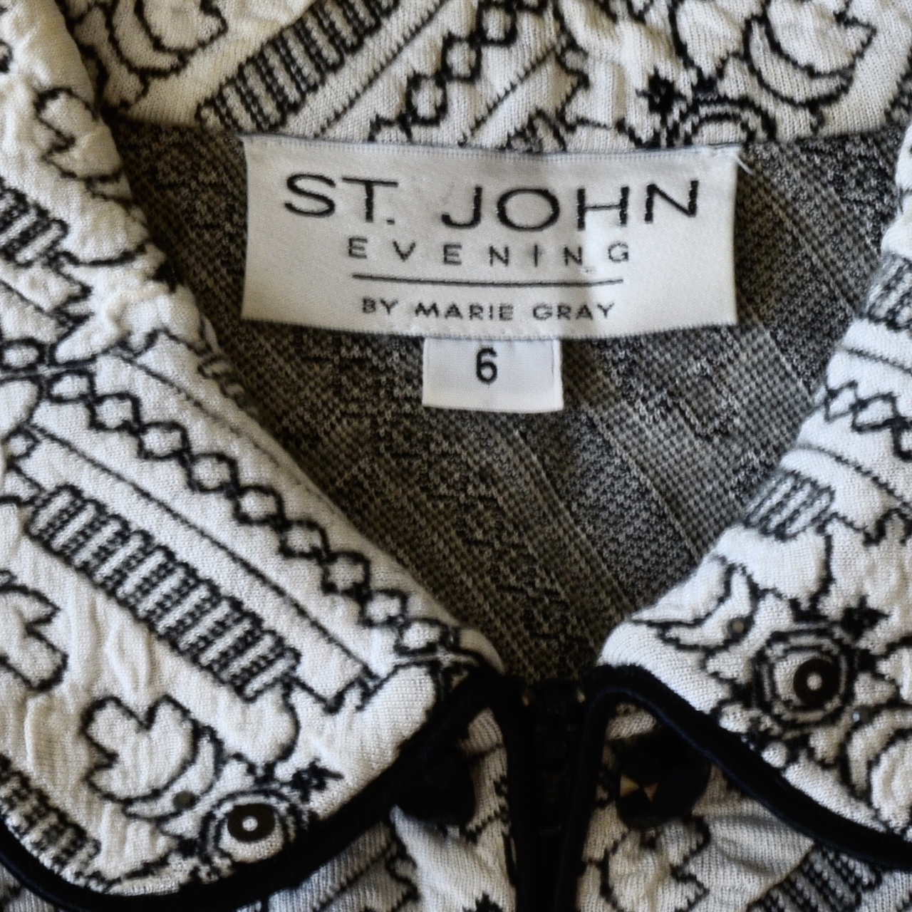 St. John Evening by Marie Gray size 6 on label. Raised pattern with small crystals and sequins sewn throughout the jacket for glitter. No shoulder pads. Has decorative black glass buttons on front and cuffs. Two faux pockets on front. Stretchy knit fabric. Measures Bust 32″ Waist 28″ Hips 32″ Shoulders 15″ Sleeves 22″ and Length from centre back is 23″. Good condition. Made in USA.