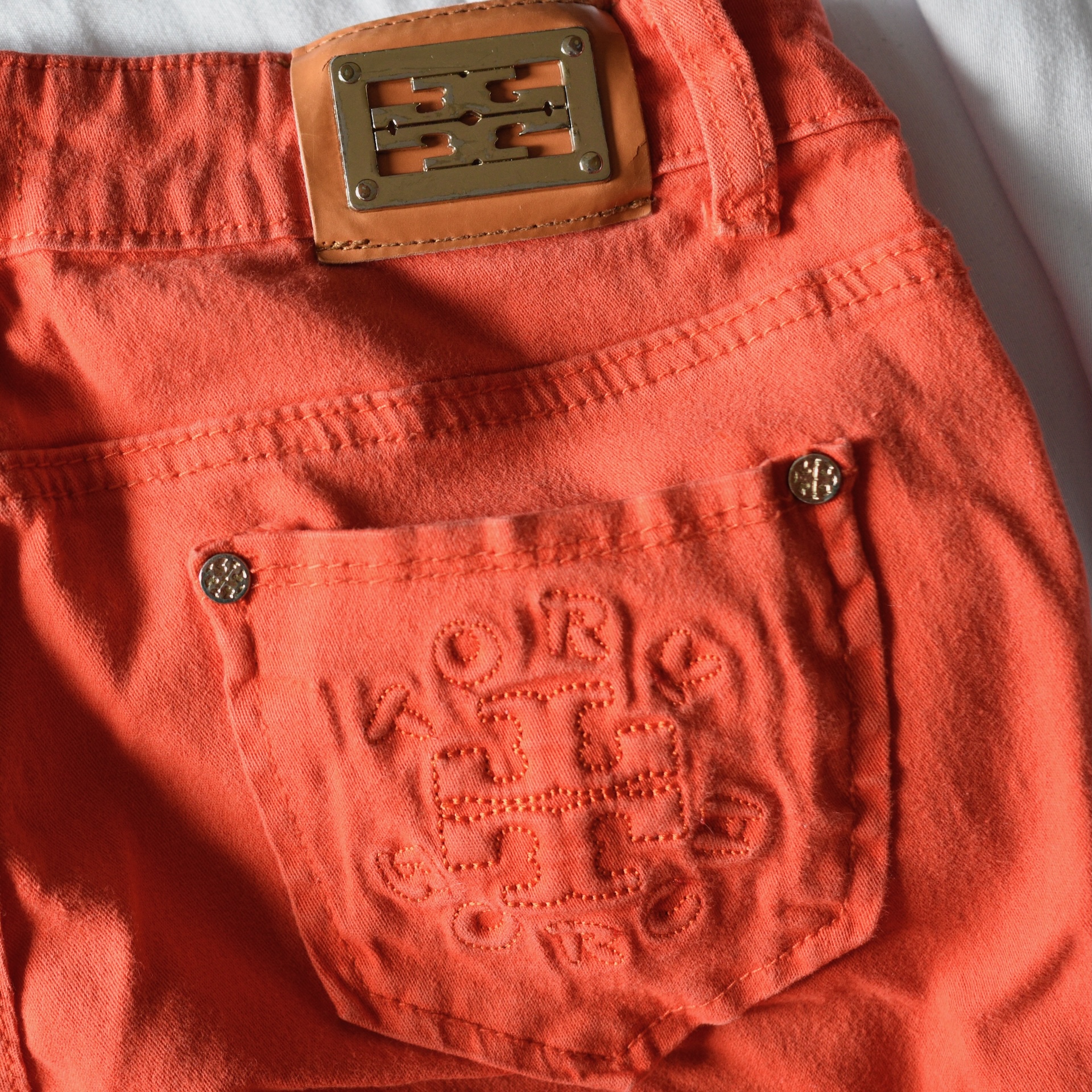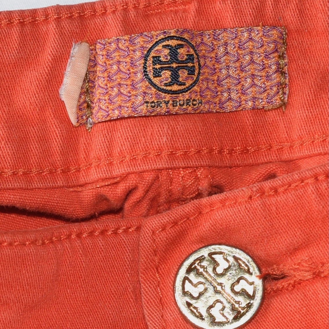 Tory Burch Skinny Orange Casual Jeans With Gold Tone Logo Accents – USA