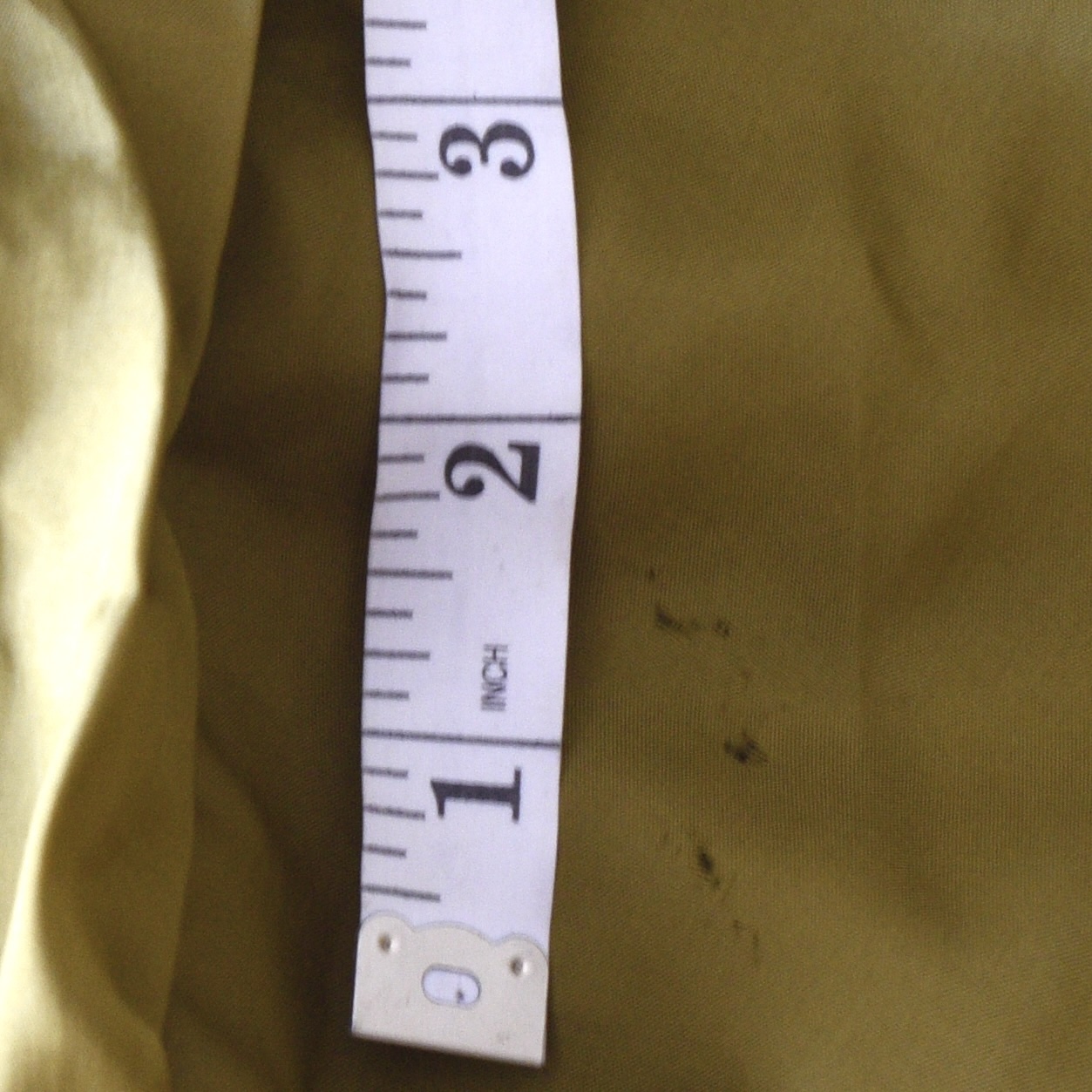 The coat has a size 9 label, but is free fitting due to it’s design and sleeve style. It has no front closures. The bust, when the coat is laid flat with the front closed measures 44-45″. The sleeve length from the shoulder seam is 19″. The cuffs are 5.5″ wide. It does not have shoulder pads. The embroidered panels down the front measure 7.5″ wide on each side. The bottom sweep measures 78″. The length from the centre back is 47″. From shoulder seam to shoulder seam it measures 19″. It has a kick pleat at the back, and slash pockets on the sides. There are a couple of small nicks in the lining. See photos.