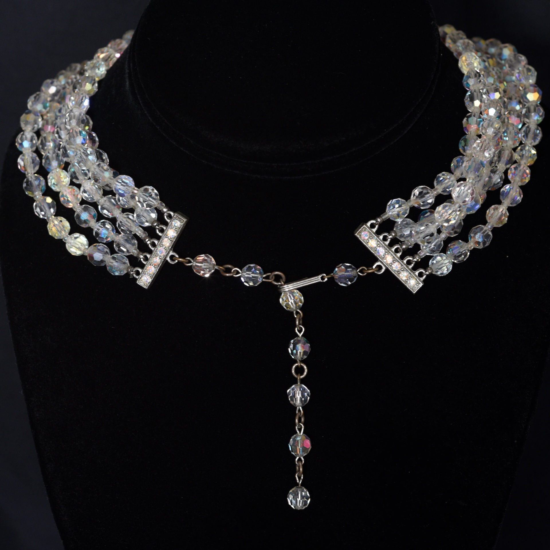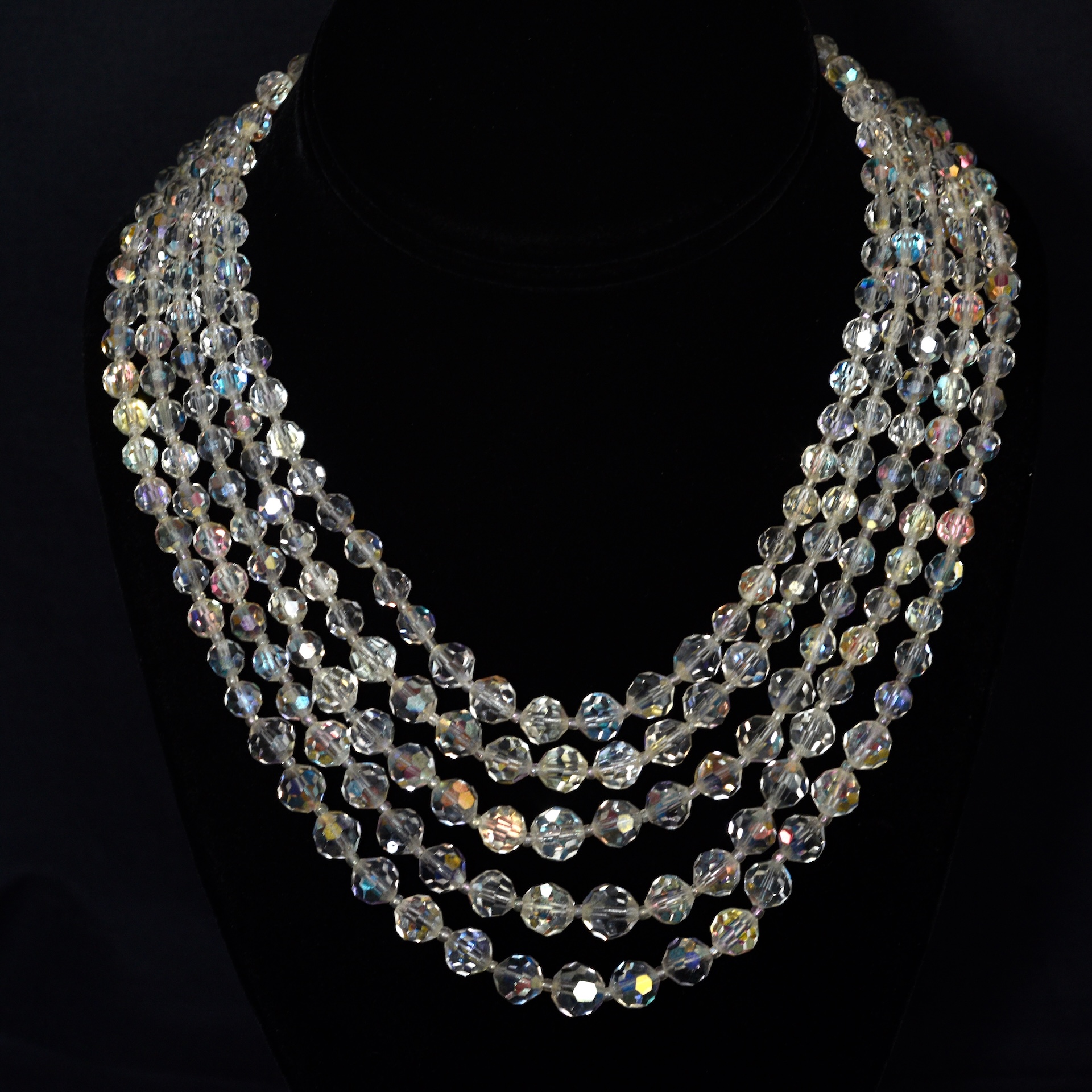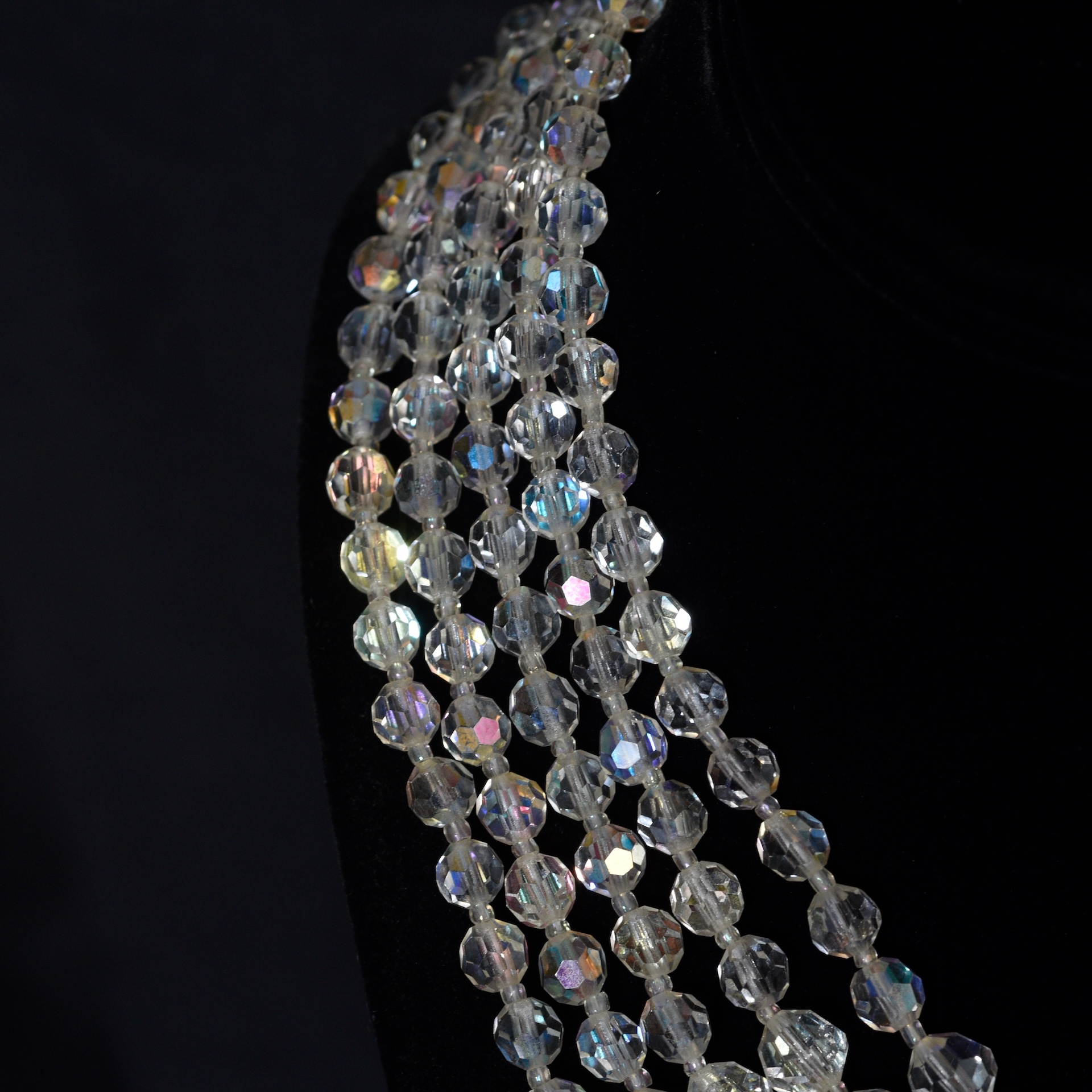 You seldom see a 1950’s crystal necklace with five strands. Most of them are single strand, and up to three strands. The extra strands really add a significant amount of light catching sparkle on these faceted crystal beads. It has a crystal studded clasp and hook closure. This is a stunningly beautiful necklace for special occasions, and for the vintage lovers who know they don’t make things like they used to. It measures 17″ long.
