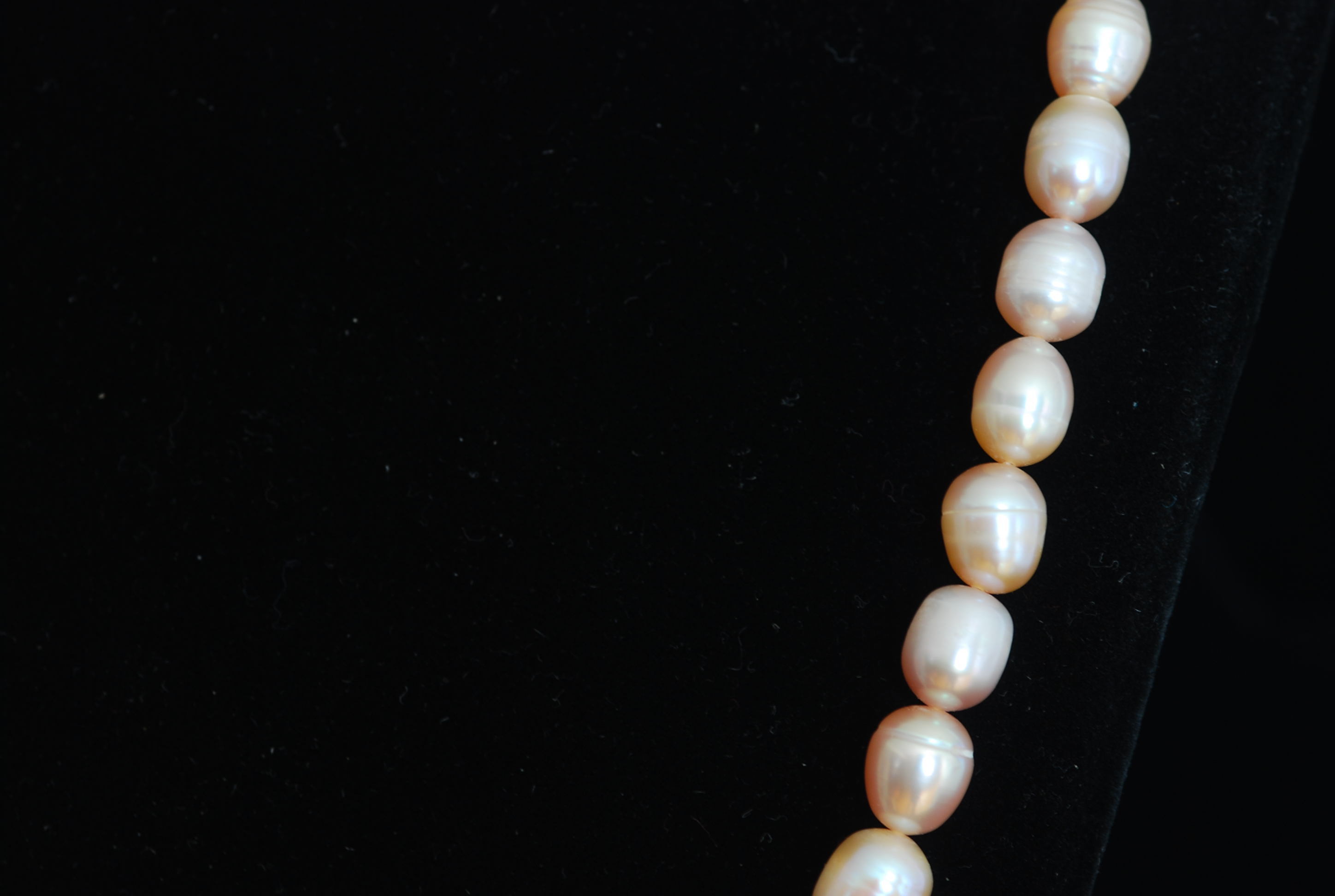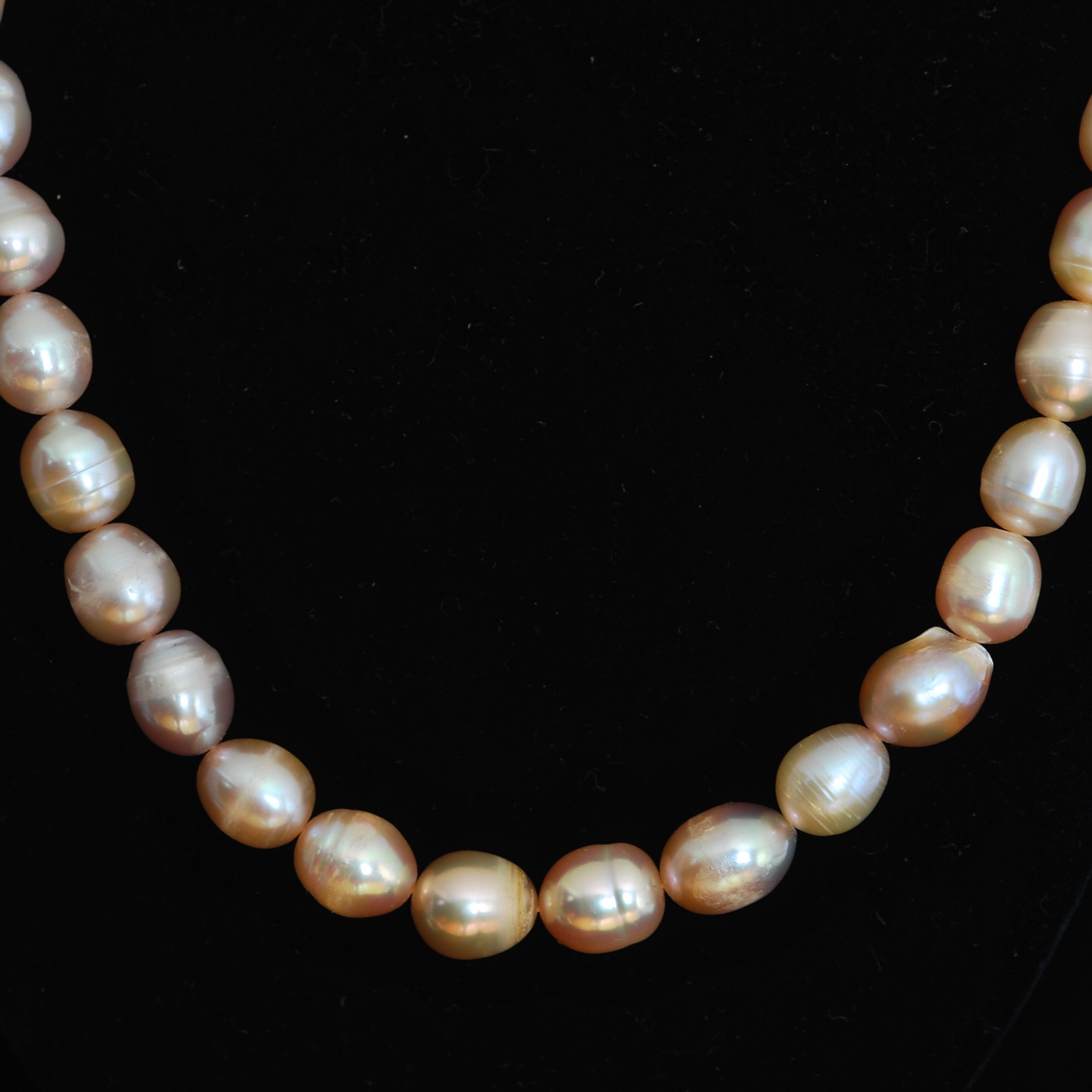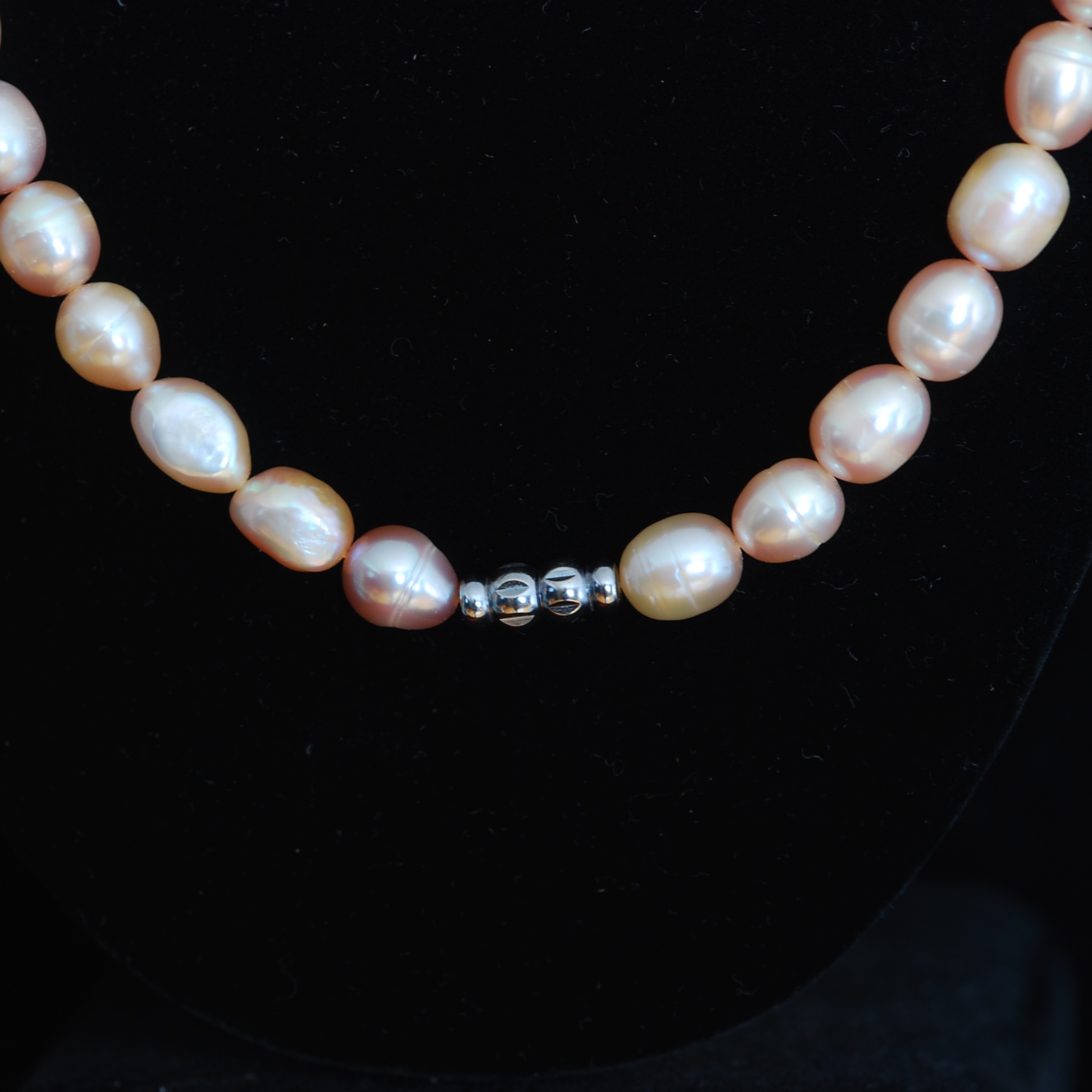 This strand of fifty five pale pink baroque pearls measures 21″ and features fairly uniform pink pearls each with subtle and unique differences. All pearls are individually knotted. It has modern silver a barrel clasp.