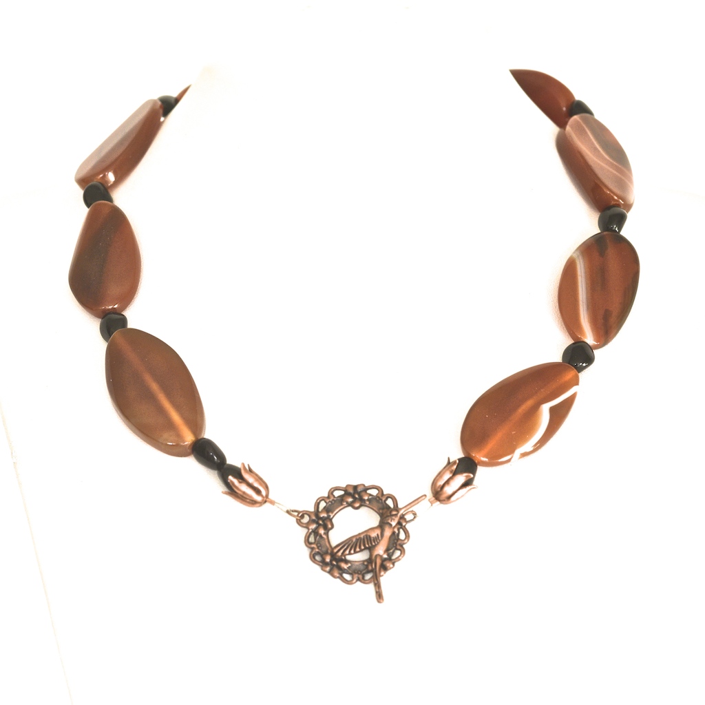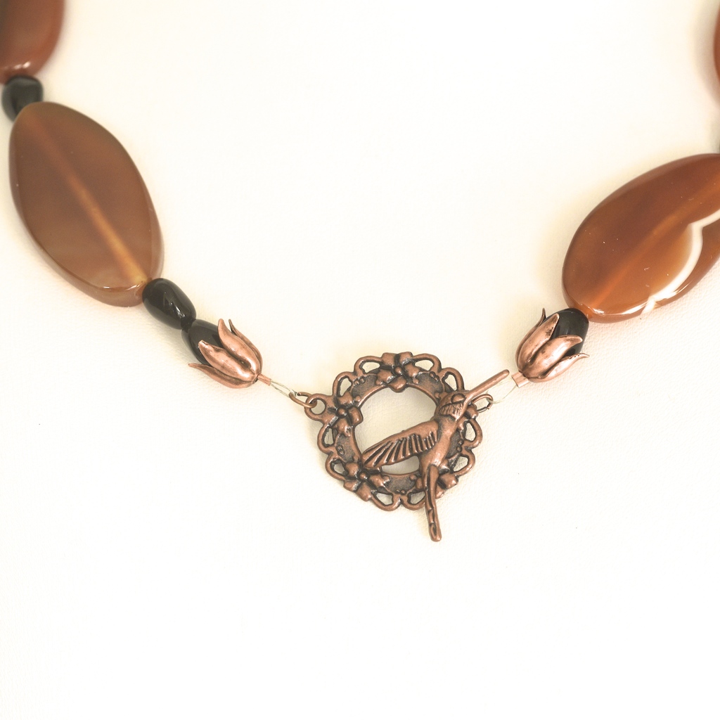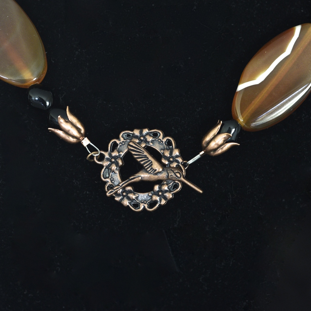 Exceptional agate necklace featuring eight honey coloured banded agate stones. On average each stone measures 1.75″ long. It has black stone spacer beads, and a copper art nouveau style toggle clasp featuring a bird, with tulip shaped coverings on the beads beside the clasp. It is in very good condition. The length is 19.5″.