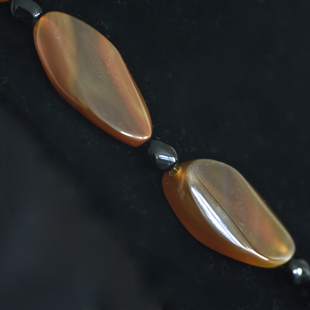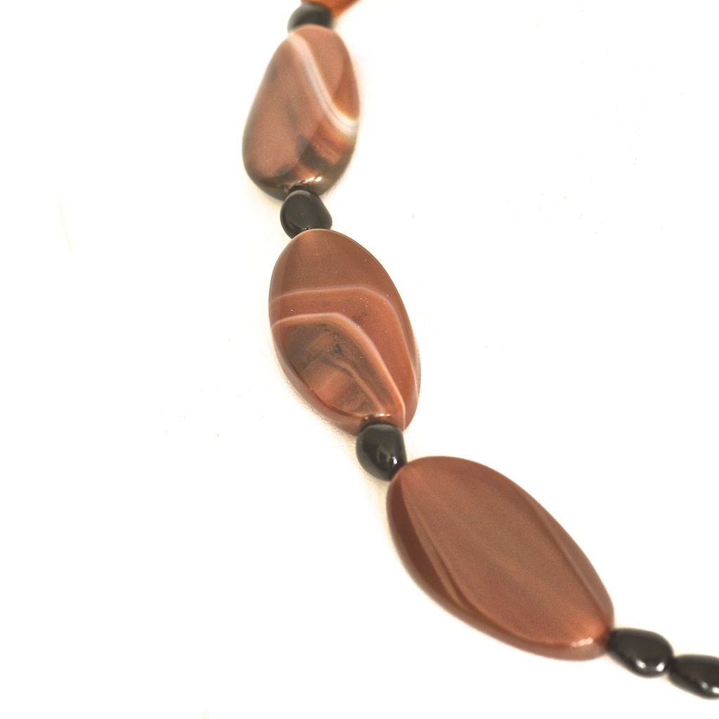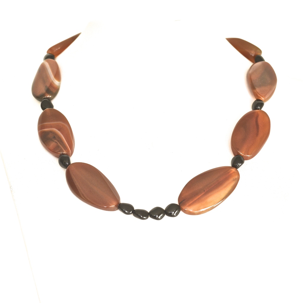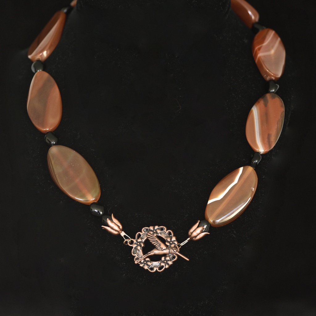 Exceptional agate necklace featuring eight honey coloured banded agate stones. On average each stone measures 1.75″ long. It has black stone spacer beads, and a copper art nouveau style toggle clasp featuring a bird, with tulip shaped coverings on the beads beside the clasp. It is in very good condition. The length is 19.5″.