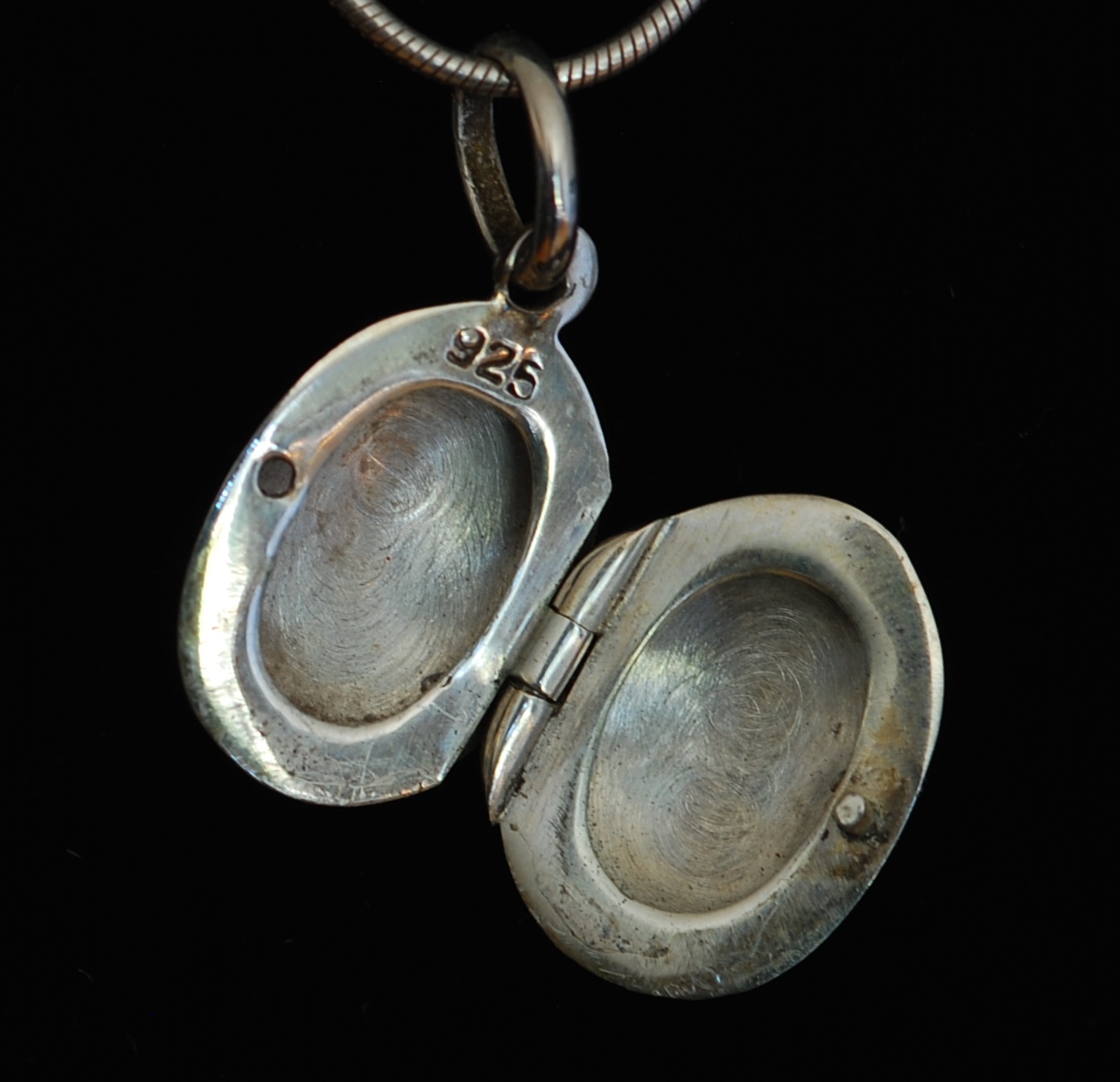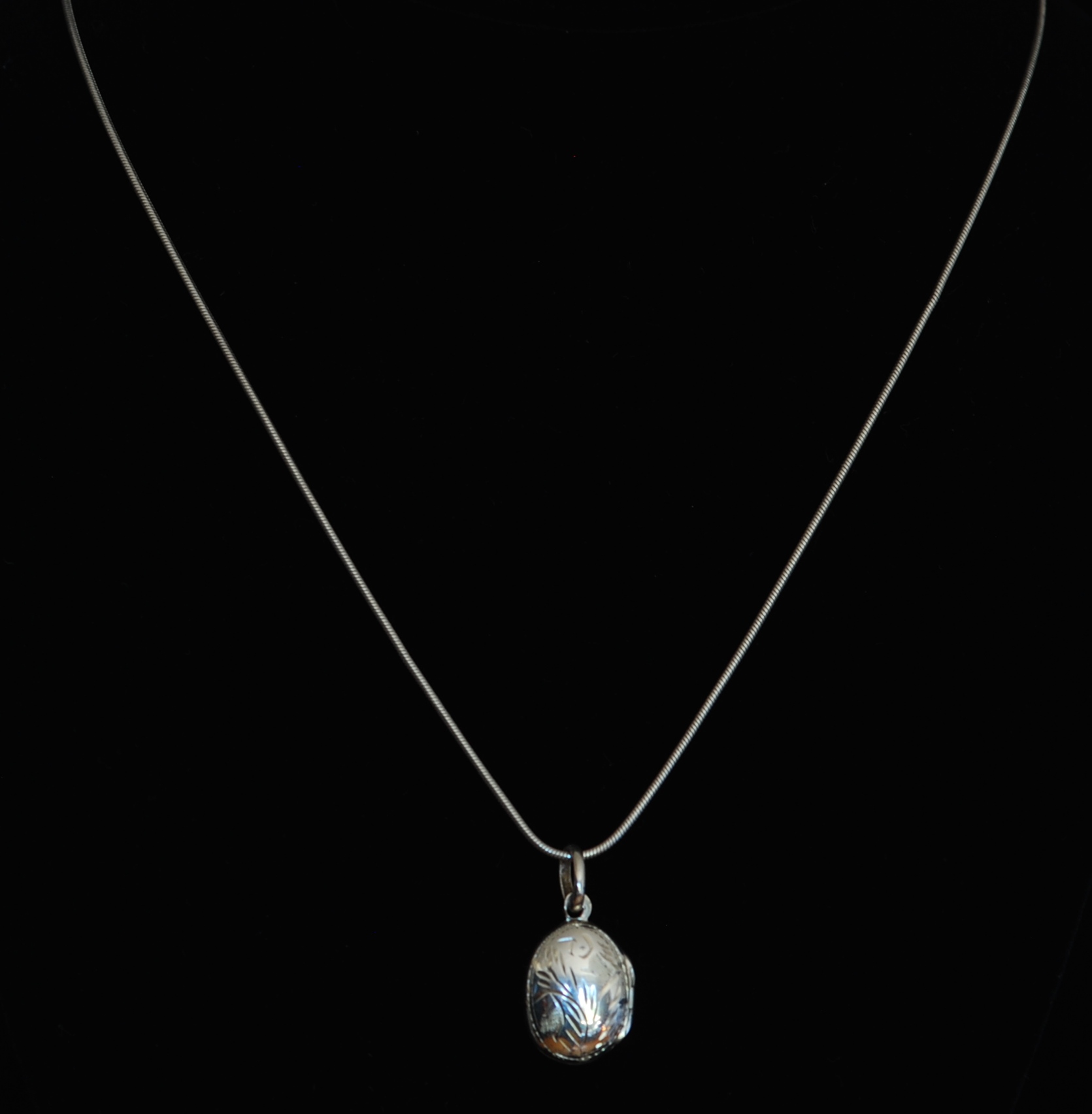 Small oval shaped sterling silver locket with detailed carving on both sides. It is hallmarked 925 inside and the chain is hallmarked on the clasp. The pendant measures .75″ not including the bail x .5″. The chain measures 18″.