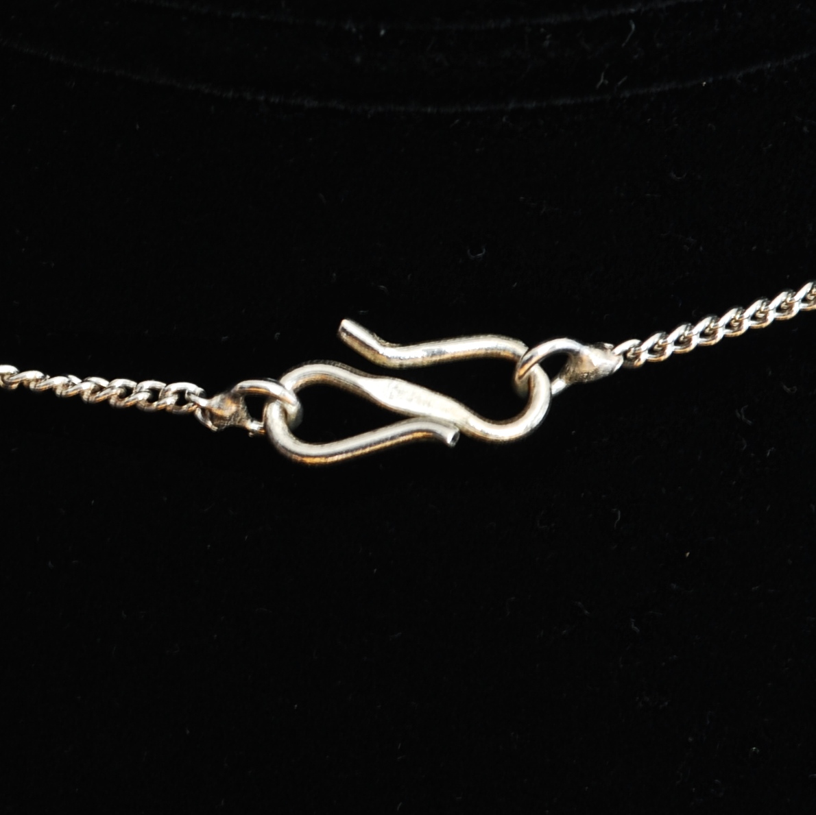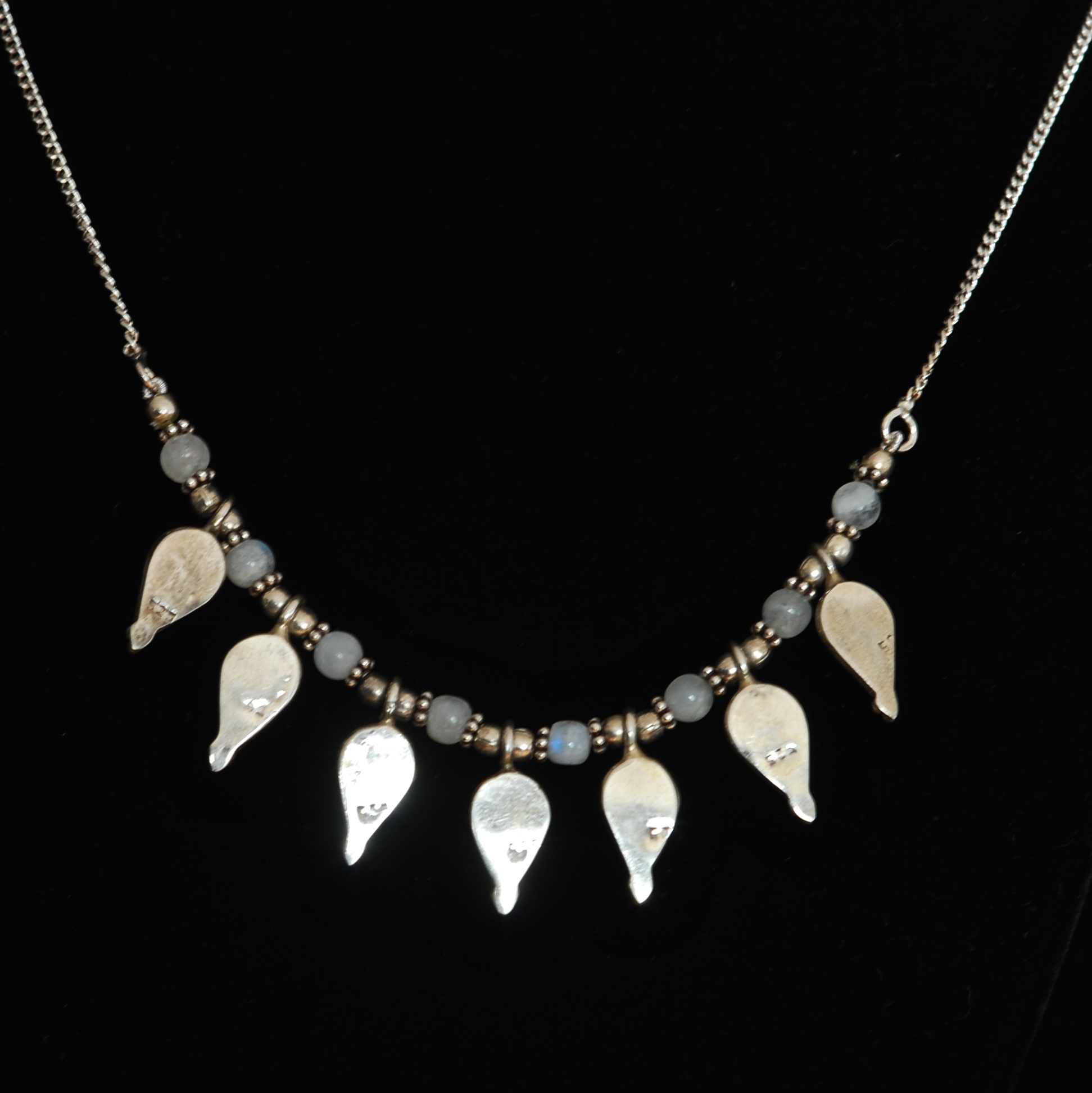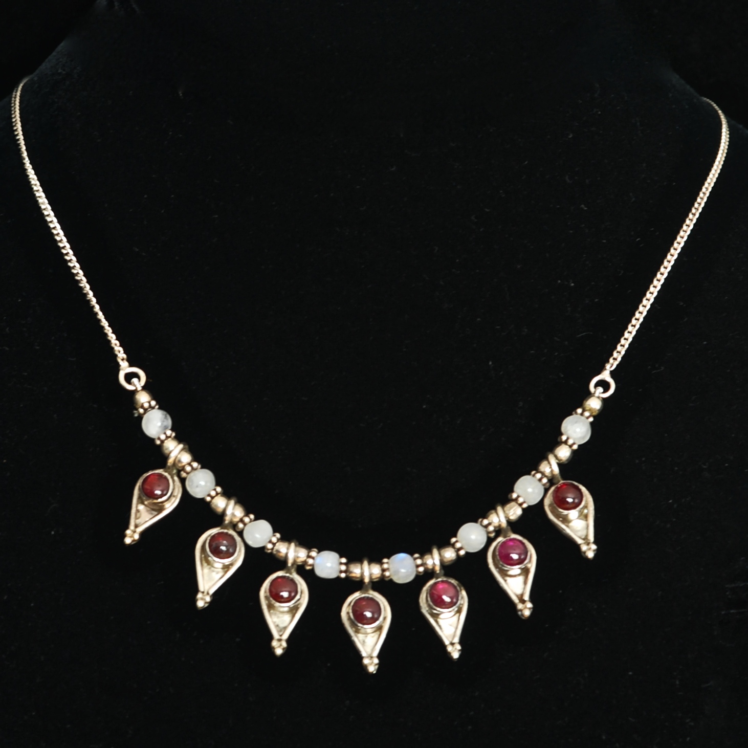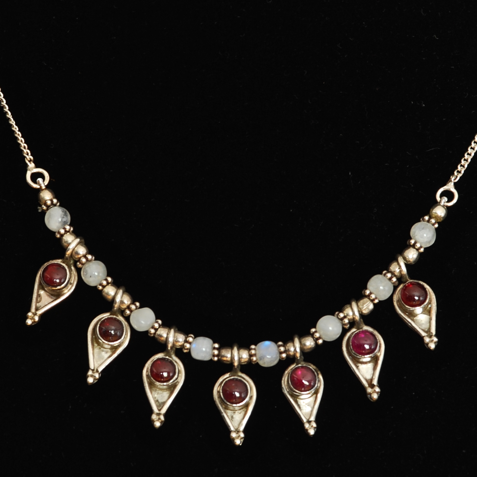 This lovely necklace features a row of teardrop shapes with bezel set round garnet cabochons for a total of seven. Above that, there is a row of eight white quartz beads. It is hallmarked 925 on the back of each teardrop as well as on the S shaped clasp. It is in very good condition.