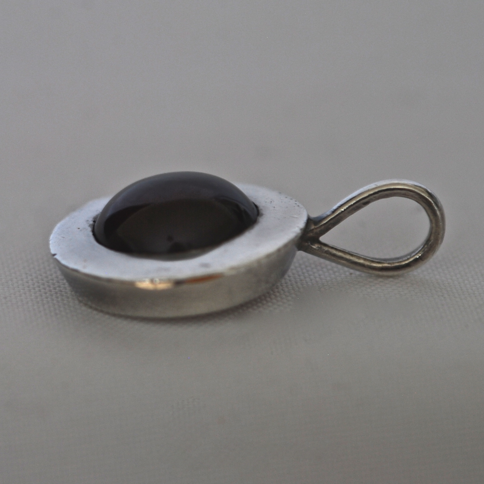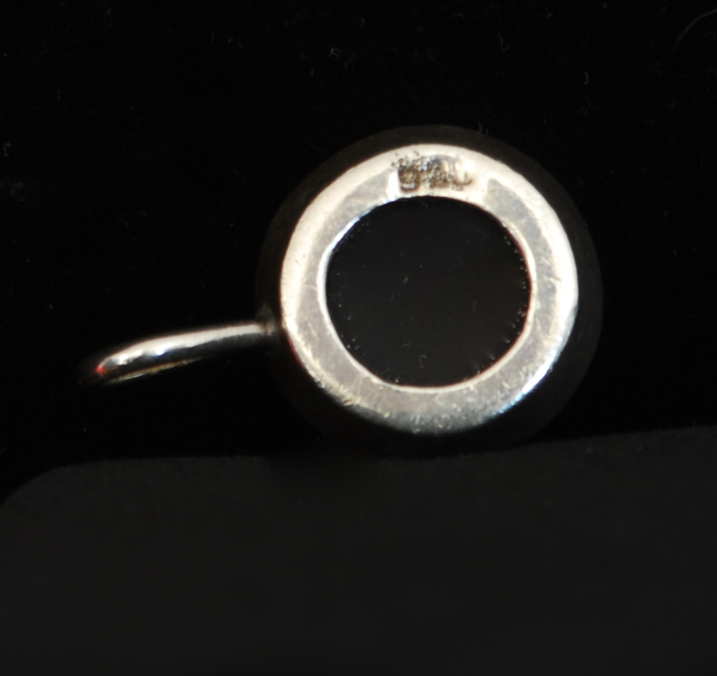 This sterling silver pendant encircles a purple garnet. It measures 1″ x 3/4″ and is hallmarked 925 on the back. Price is for pendant only.