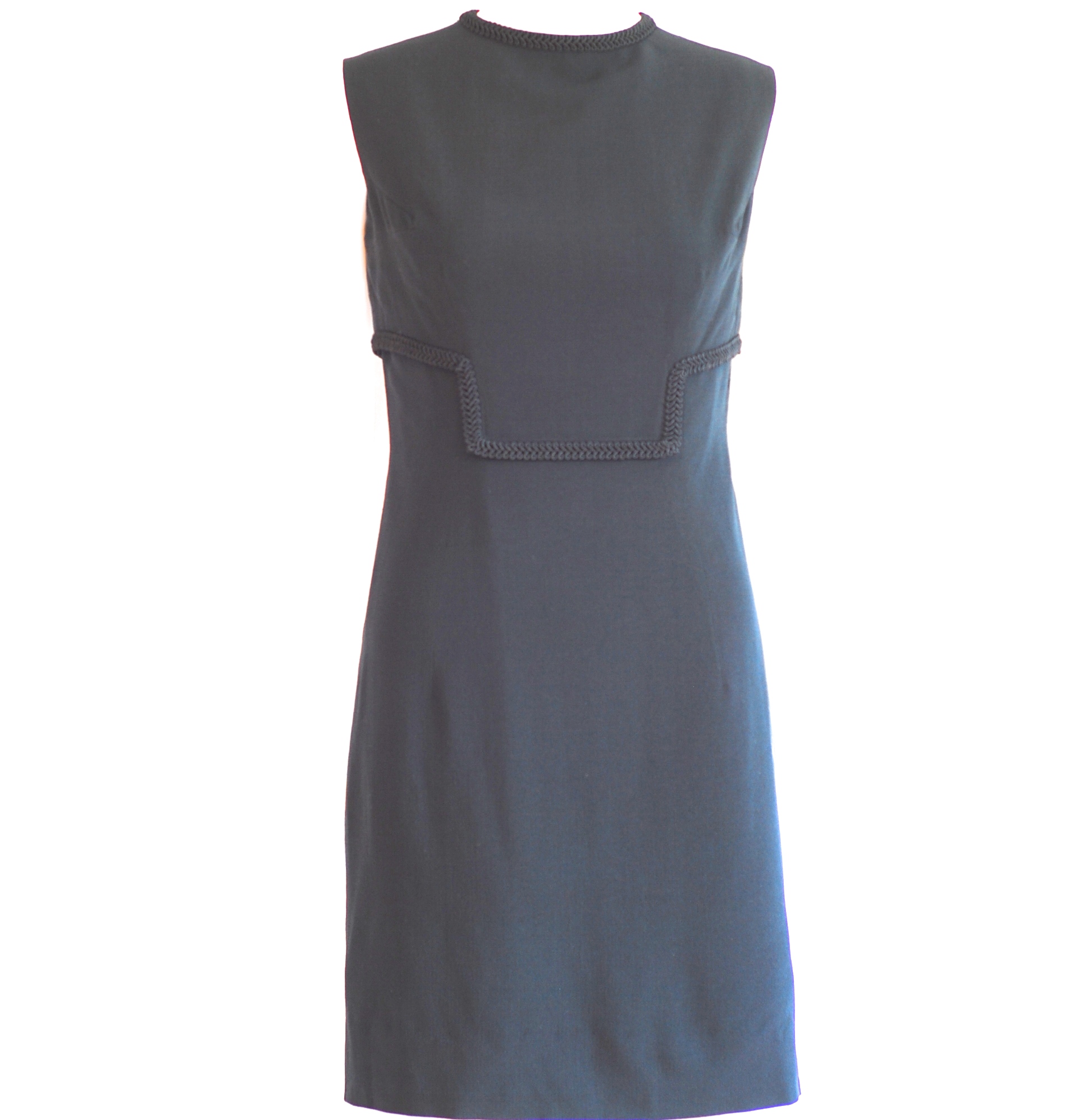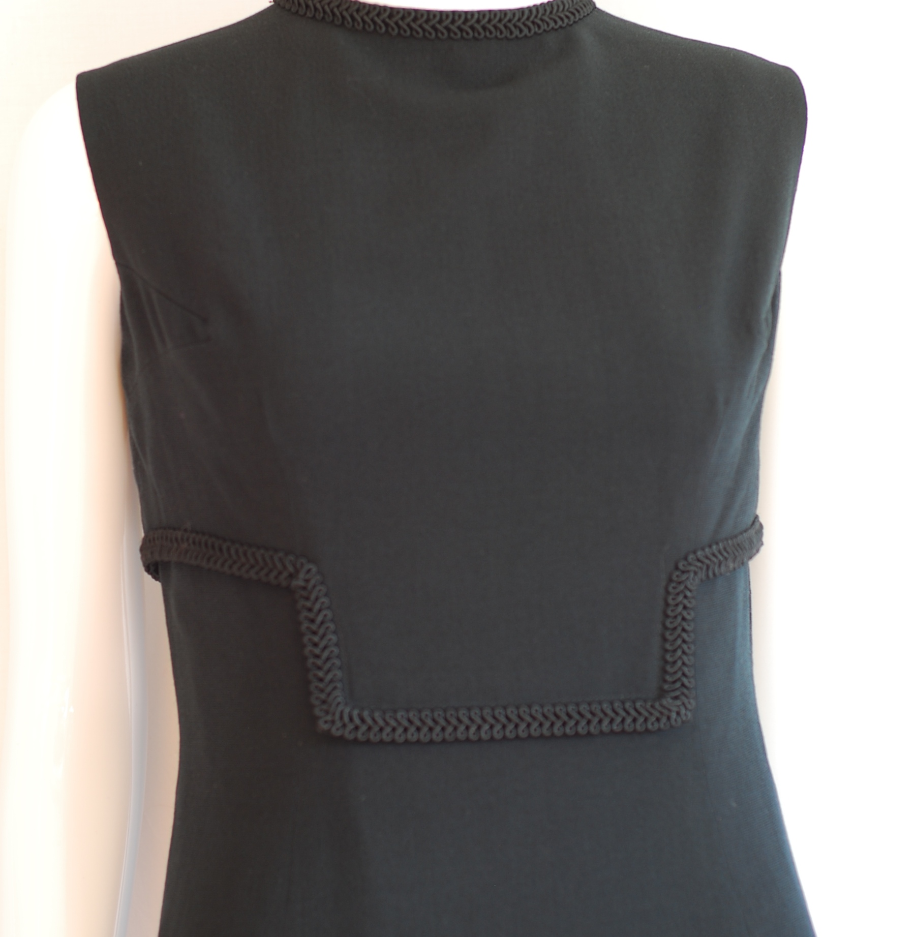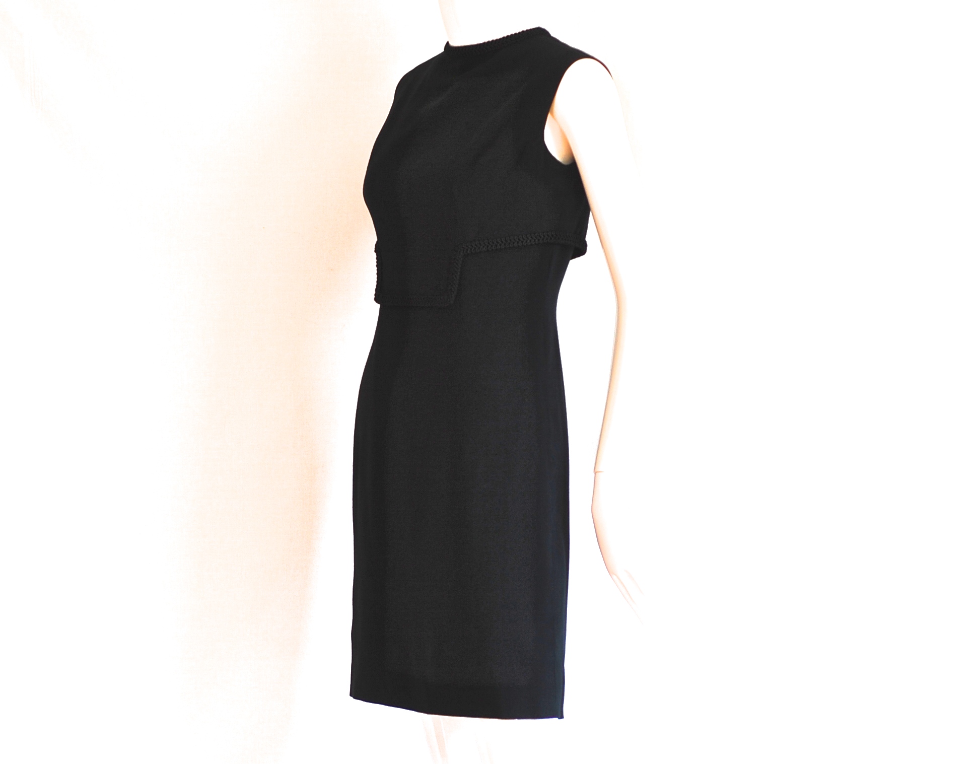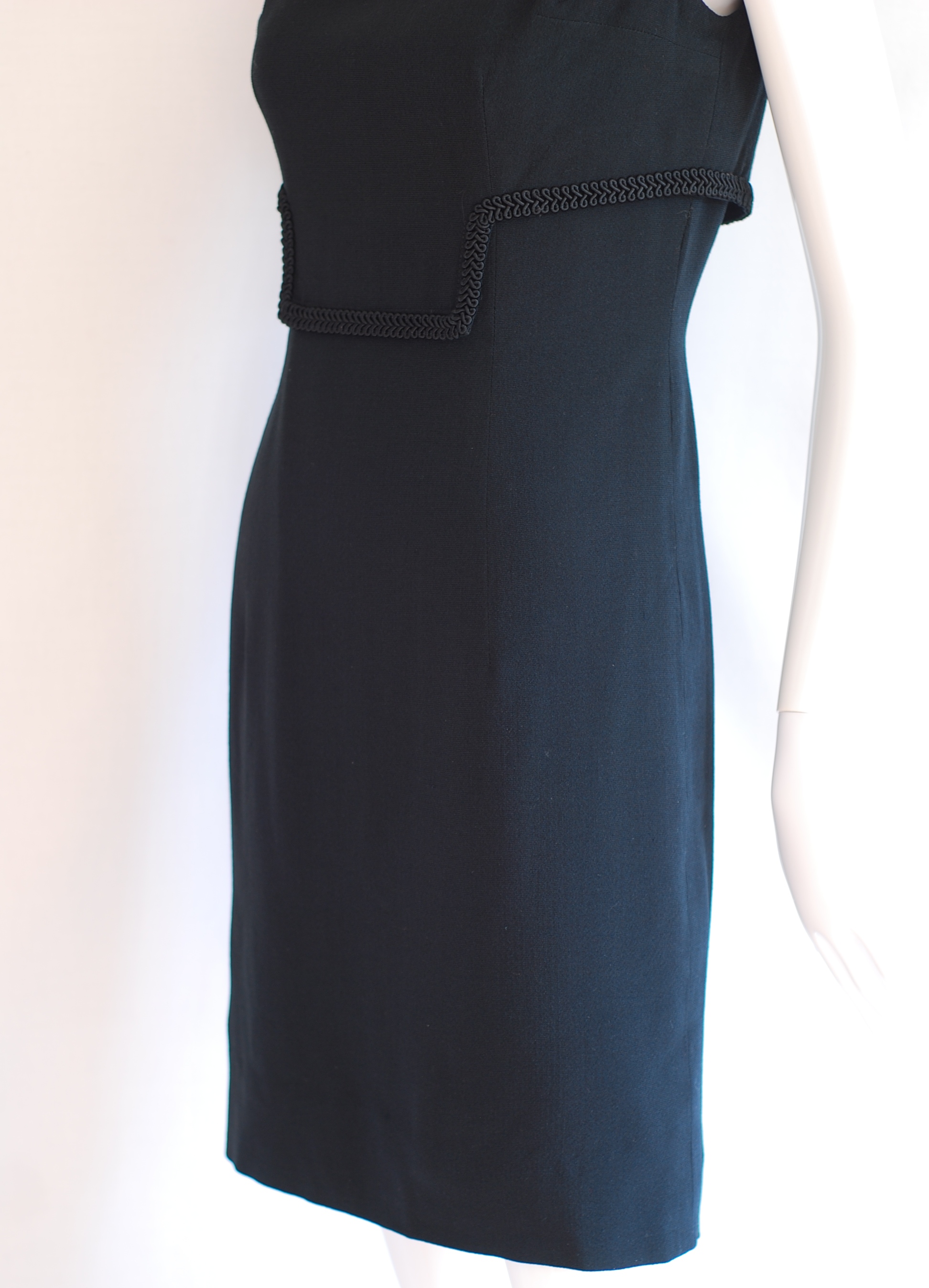 Simple elegance in this lined, form fitting little black dress with trim detail on front and collar. Size small (4-6)