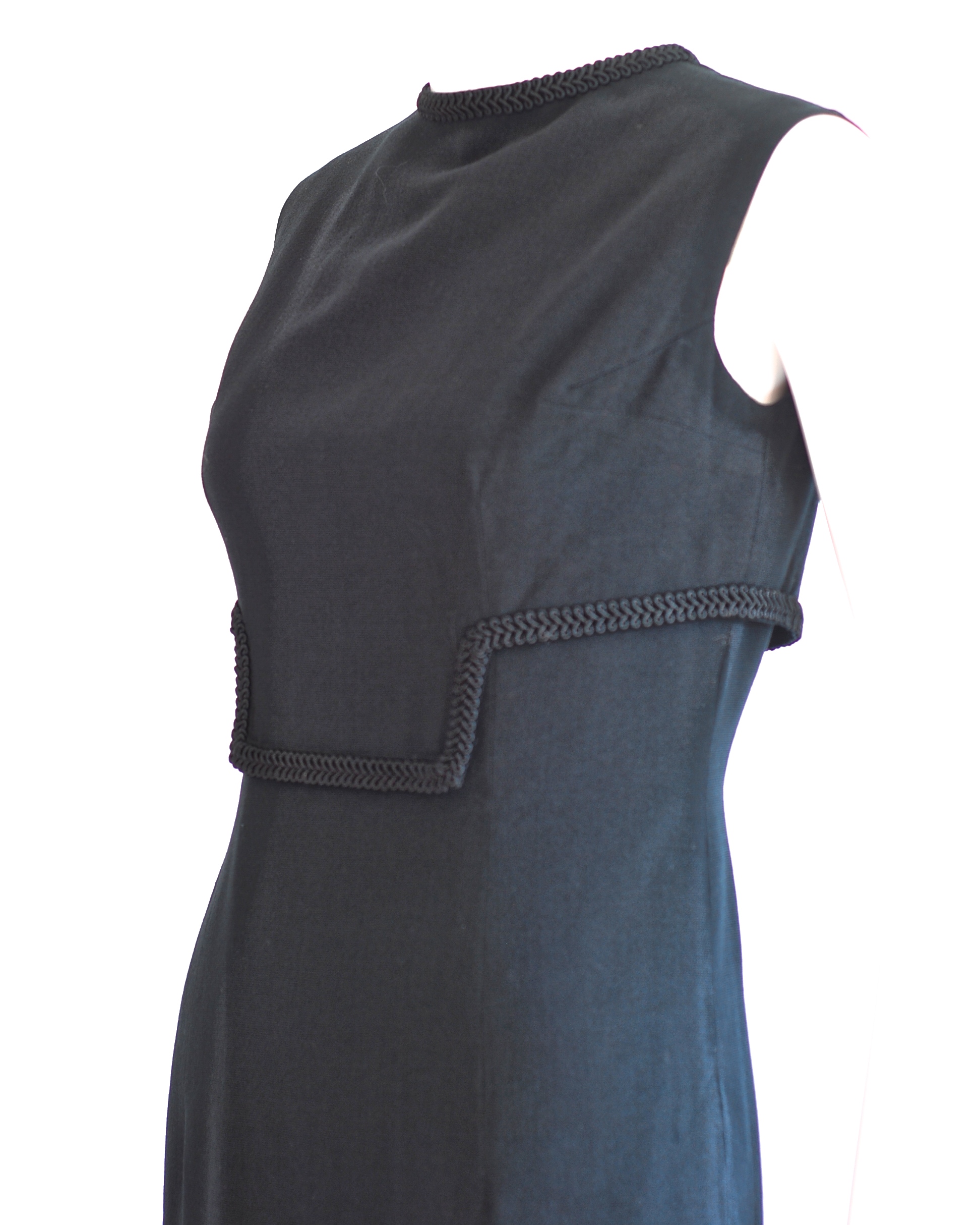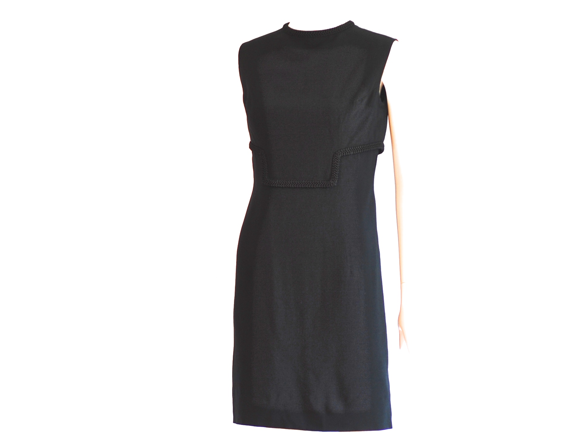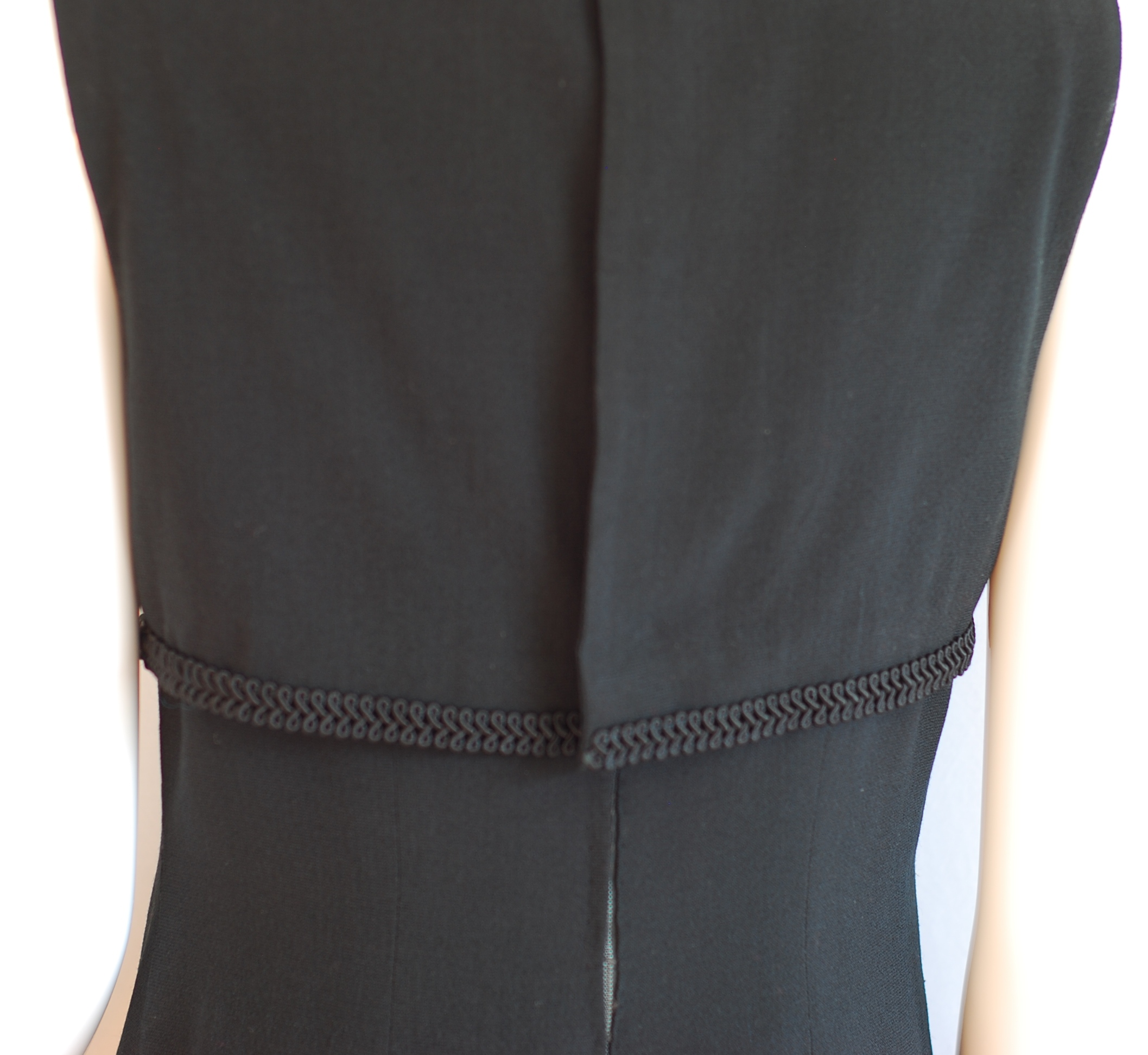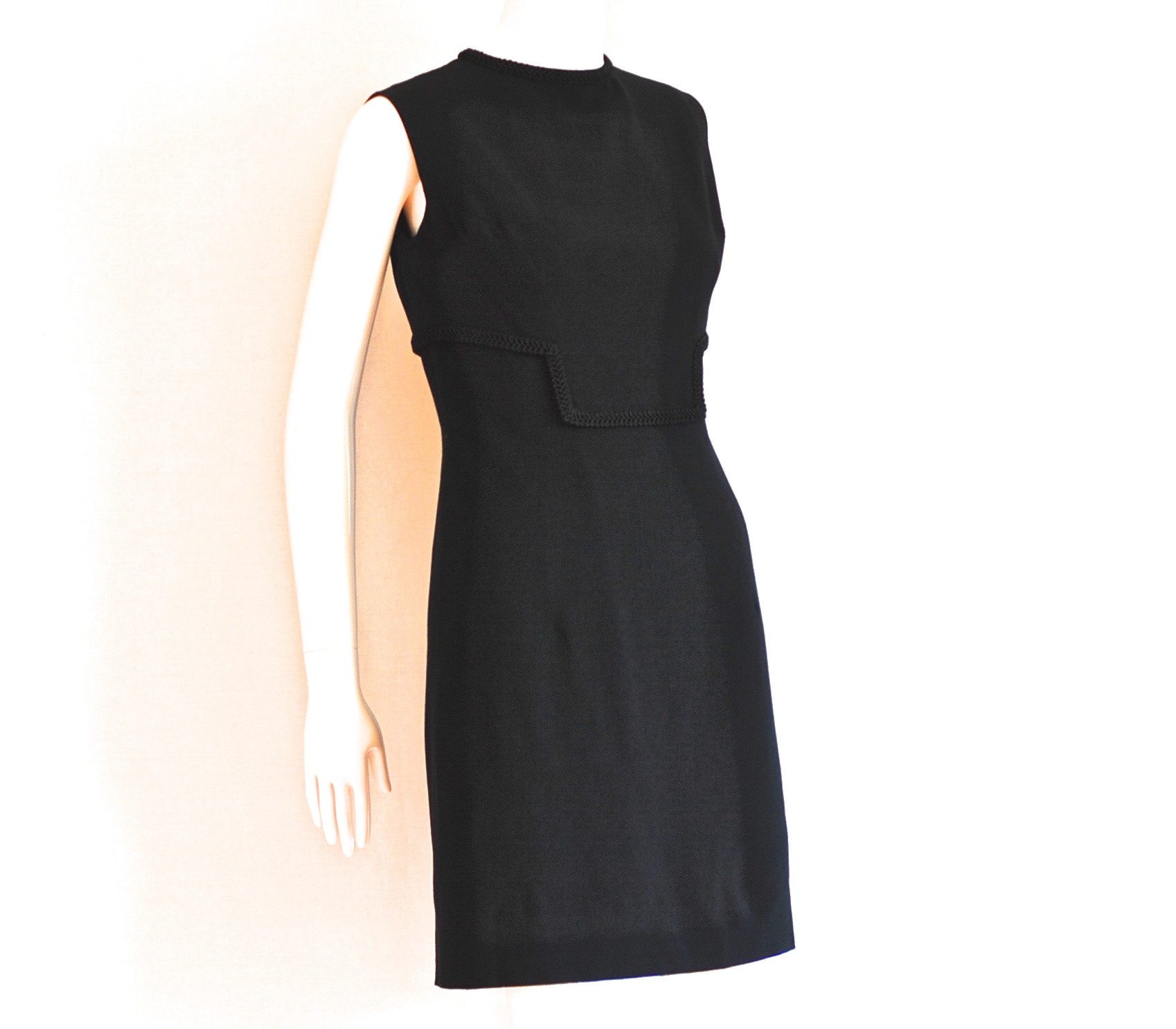 Simple elegance in this lined, form fitting little black dress with trim detail on front and collar. Size small (4-6)
