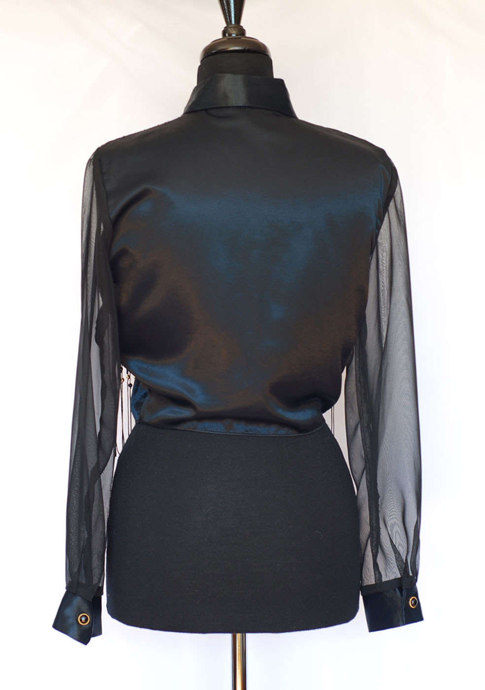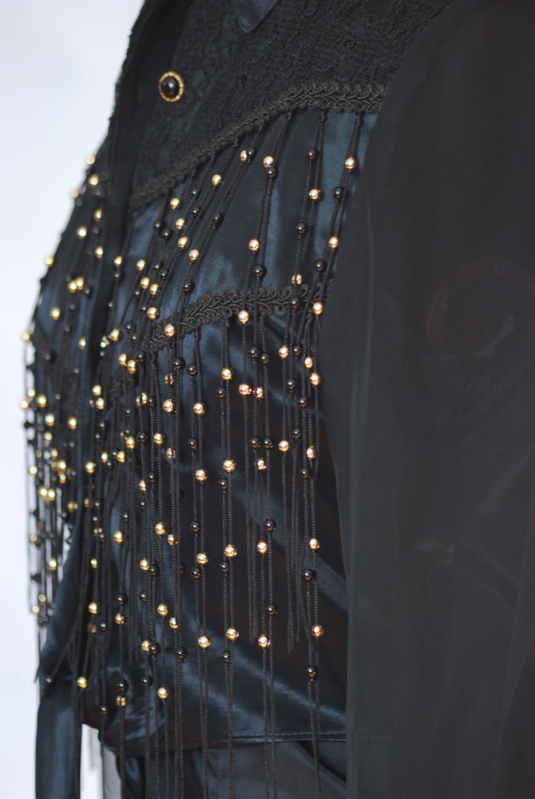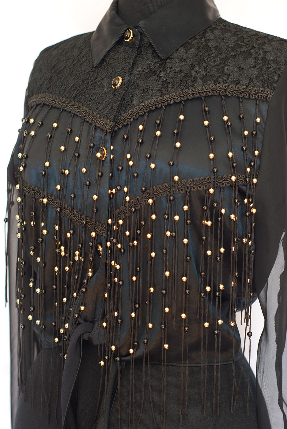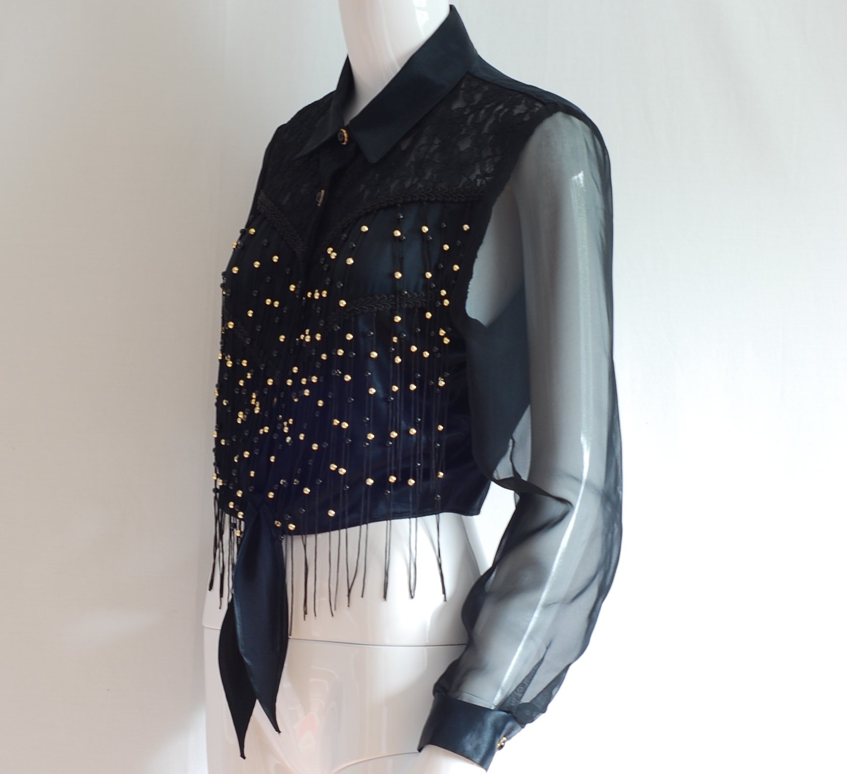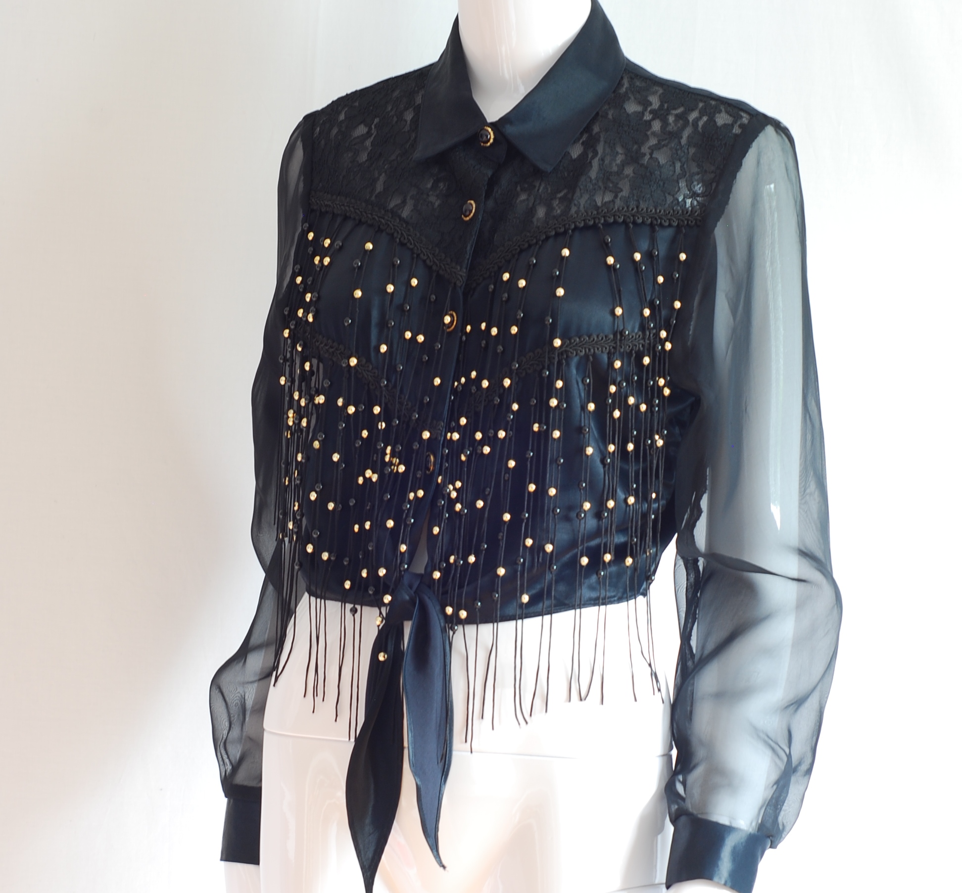 Cropped dressy black top with beaded tassels on the front. This blouse is made of satin and lace, with a western flair. The lace and trim is in the shoulder area with gold beads on the front that are strung into the tassels. The front has a tie at the waist. The sleeves are sheer with satin, single buttoned cuffs. It is a size medium. It measures sleeve length 23″, bust 36″, waist 30″ and length from centre back is 18″. Made in the USA. The condition is excellent.