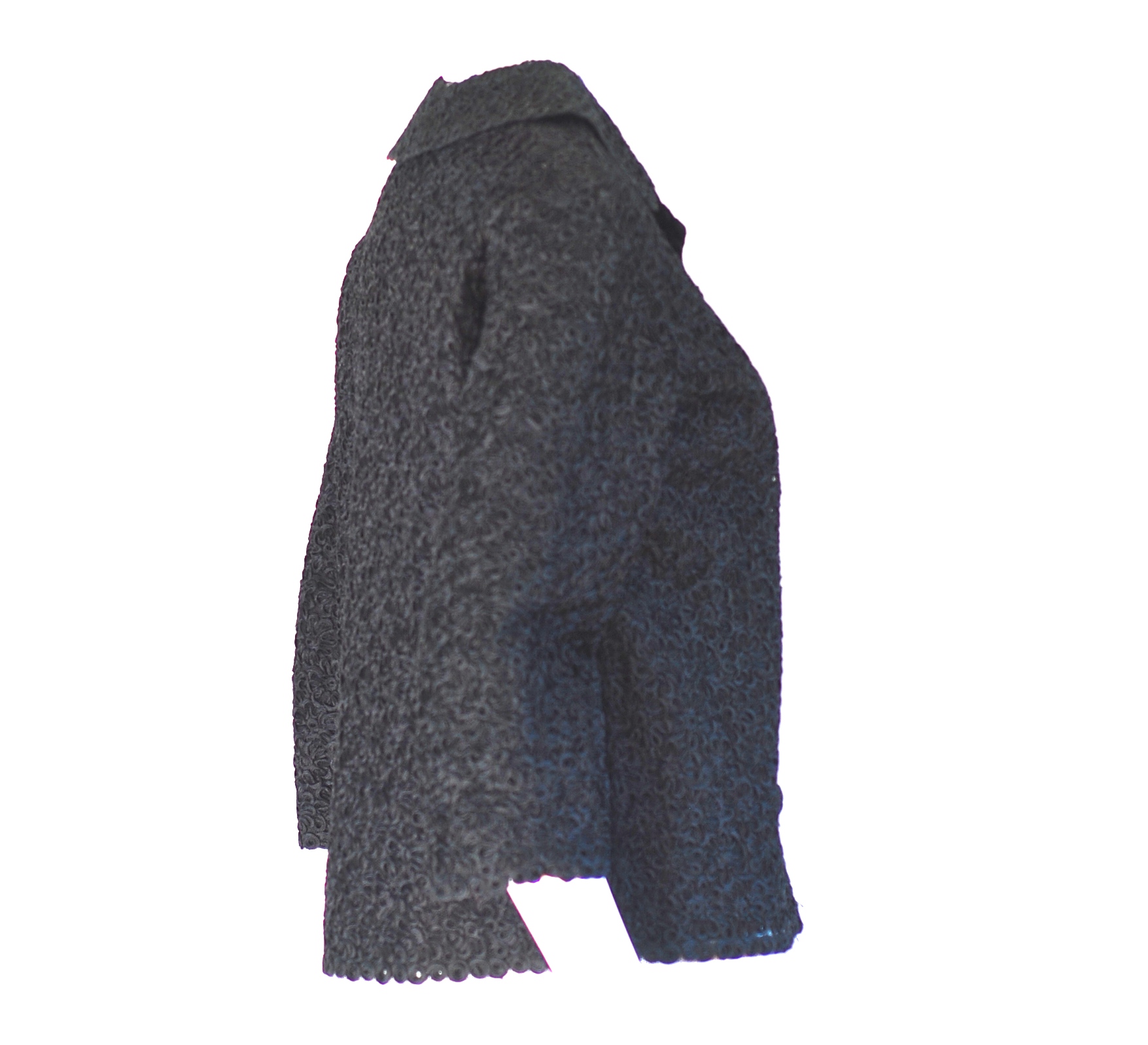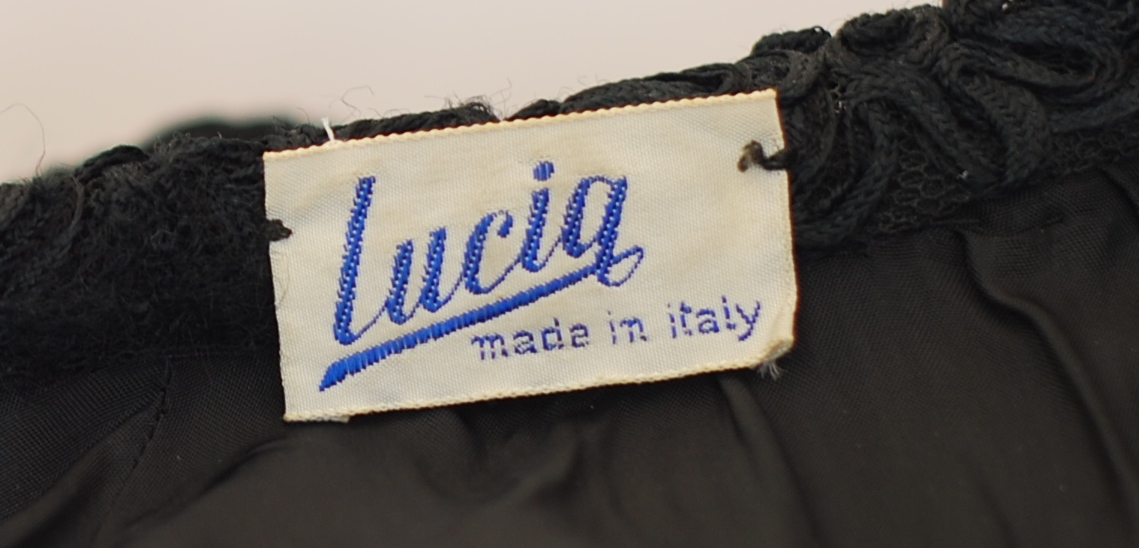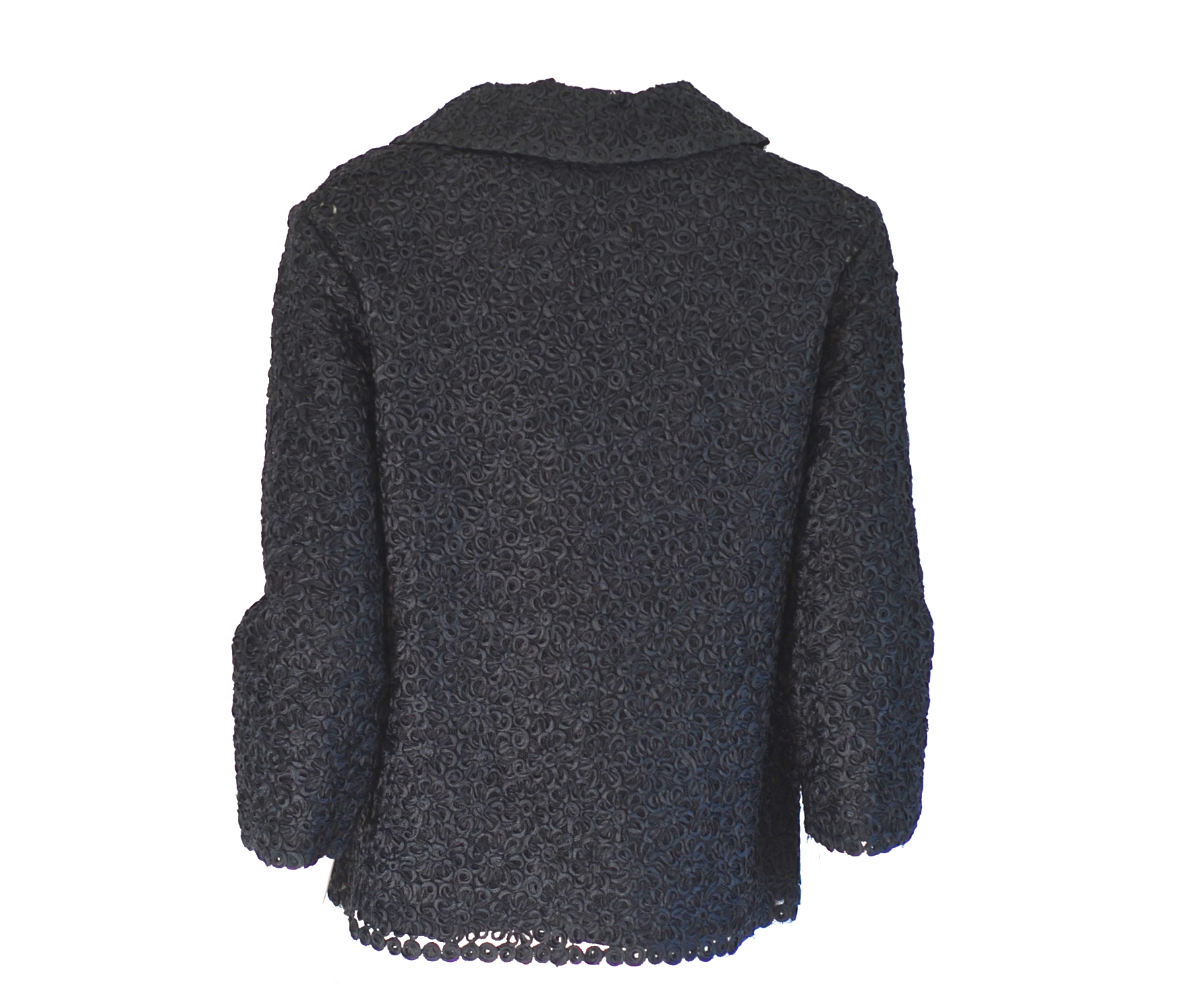 The vintage fabric that this jacket is made of is truly amazing. The base is a net fabric with a raised floral pattern over it that looks like it is made of finely arranged narrow ribbon. It has matching fabric covered buttons. Made by Lucia in Italy. Size 8. The three quarter length sleeves measure 17 1/2″. Bust 36″ Waist 36″ Hips 38″. Length from centre back is 22 1/2″. Made in Italy.