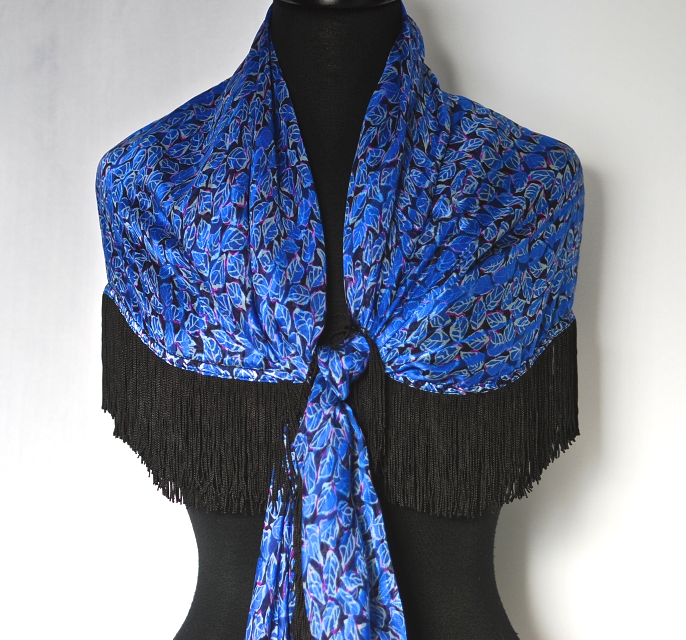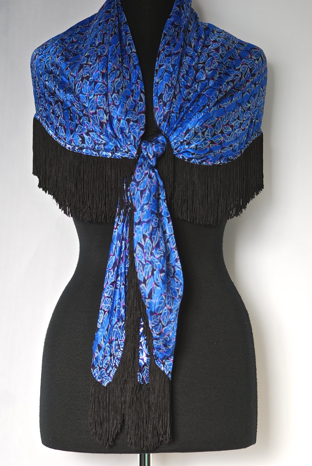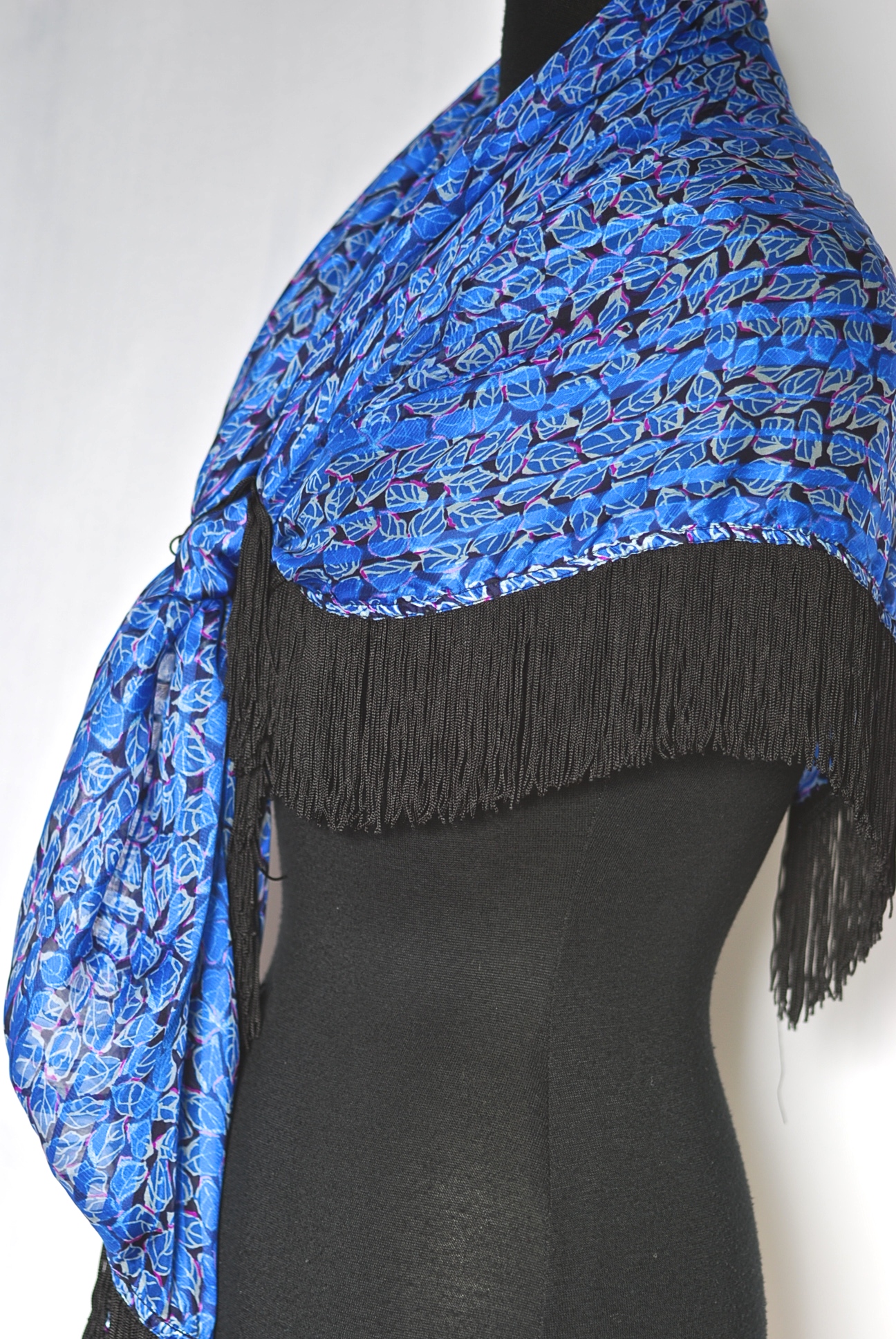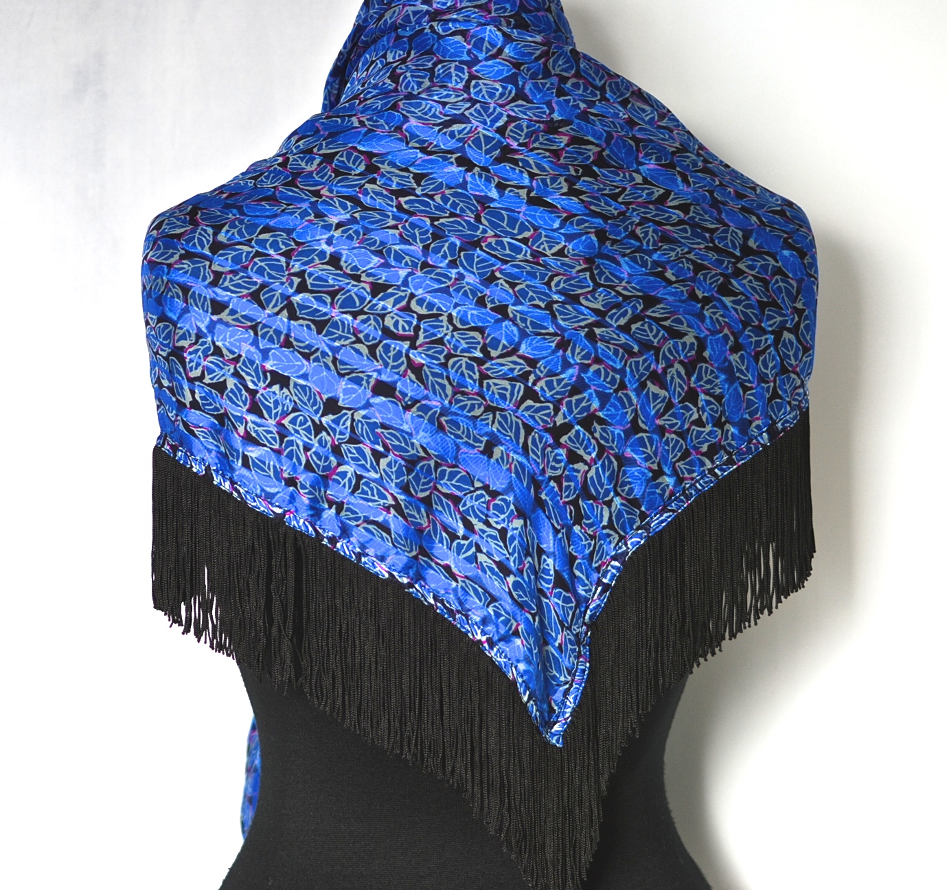 Gorgeous large blue silk scarf fringed all the way around. The scarf measures 42″ x 36″ not including the 3 1/2″ fringe. It is unsigned. The condition is excellent.